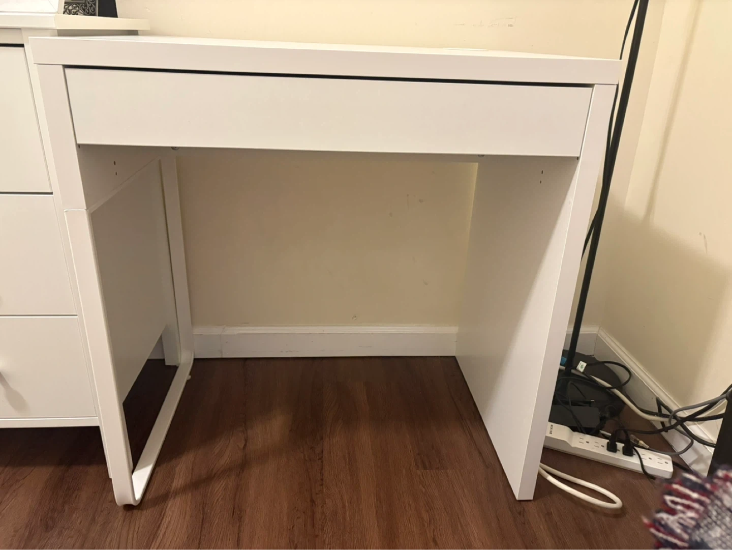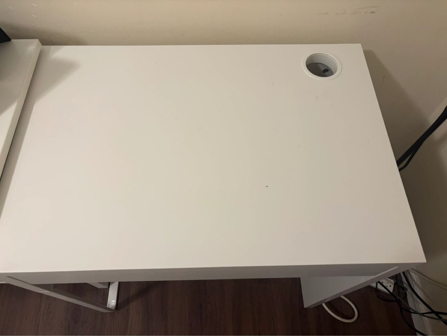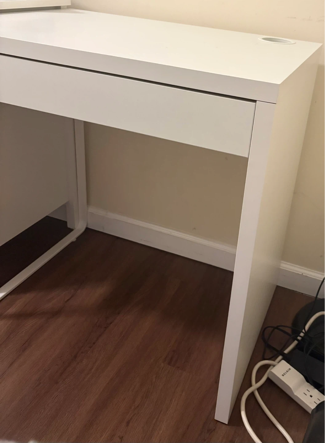 A clean white writing desk featuring a single drawer and a convenient cable management hole on the surface. This desk offers a minimalist design suitable for various spaces. White finish.