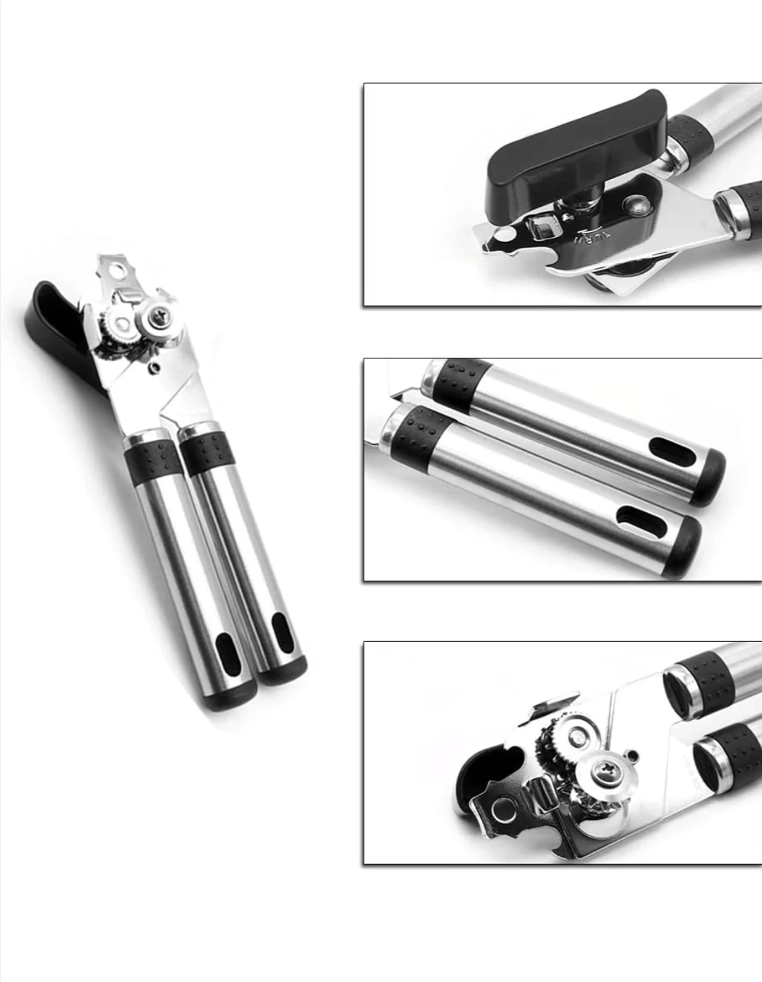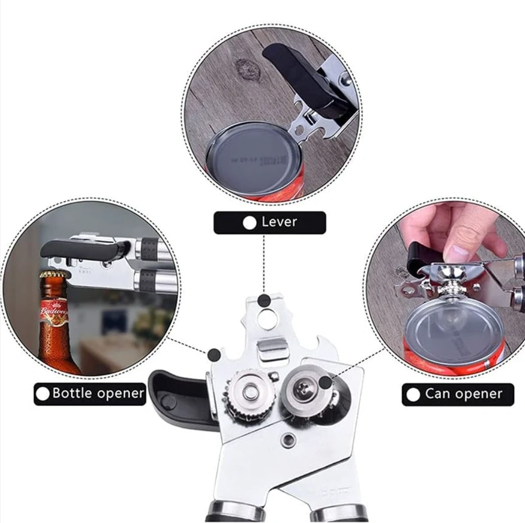 This Aoriti can opener has a 3-in-1 handheld design. It's made with stainless steel for durability. This tool also includes a bottle opener function.