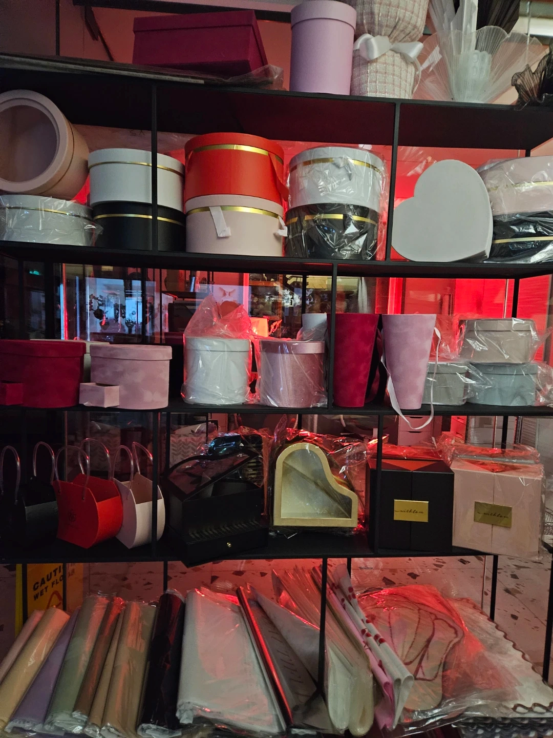 Assorted decorative gift boxes in various shapes and colours, including round, heart, and square designs. Also available are flower arrangement boxes, paper bags, and rolls of wrapping paper in a wide range of colours. Great for any gifting occasion!