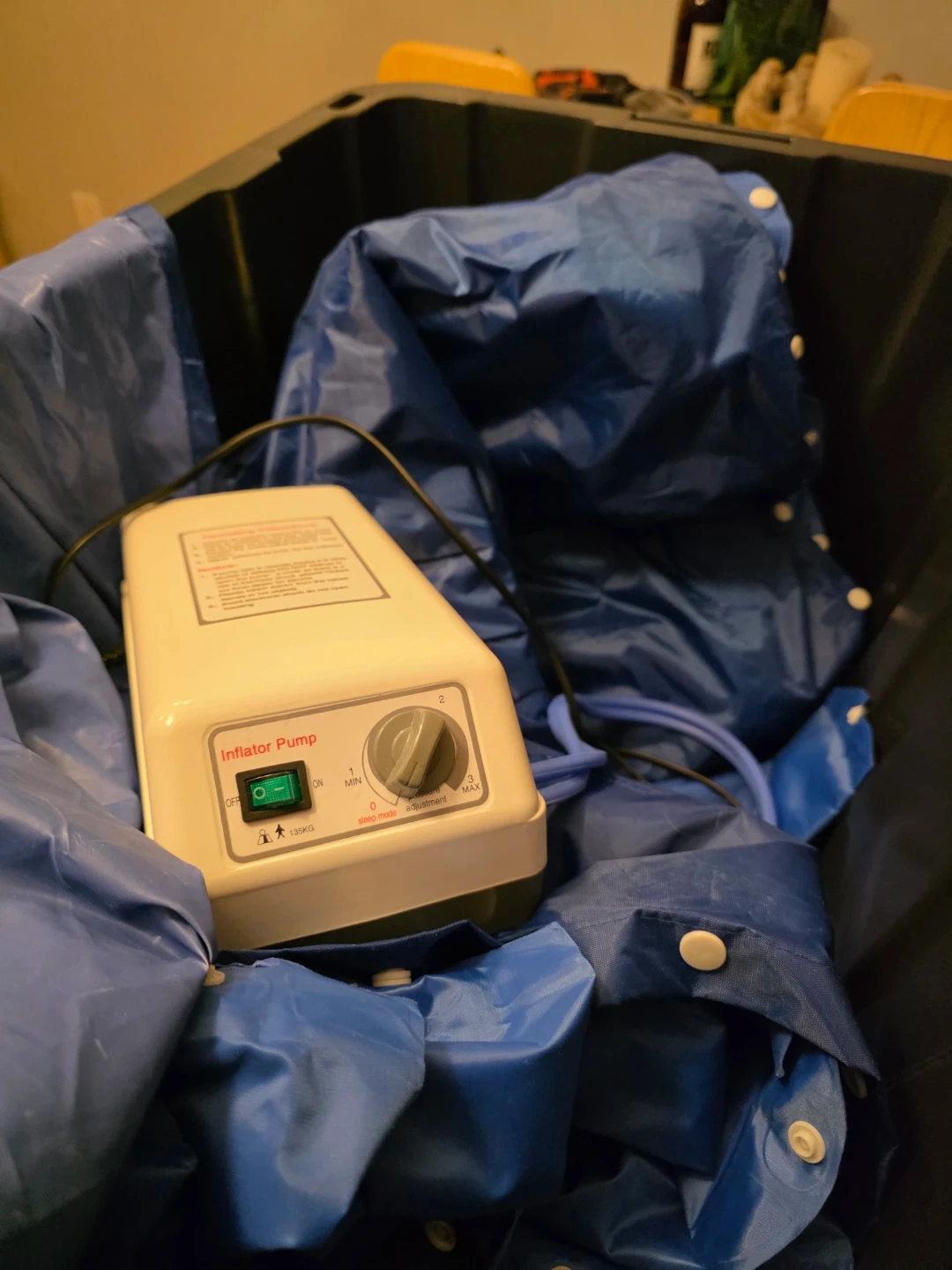 This Zontex alternating pressure mattress comes with an inflator pump. It's designed to provide comfort and support. The pump allows for continuous inflation and deflation cycles. Its to prevent bed soars.