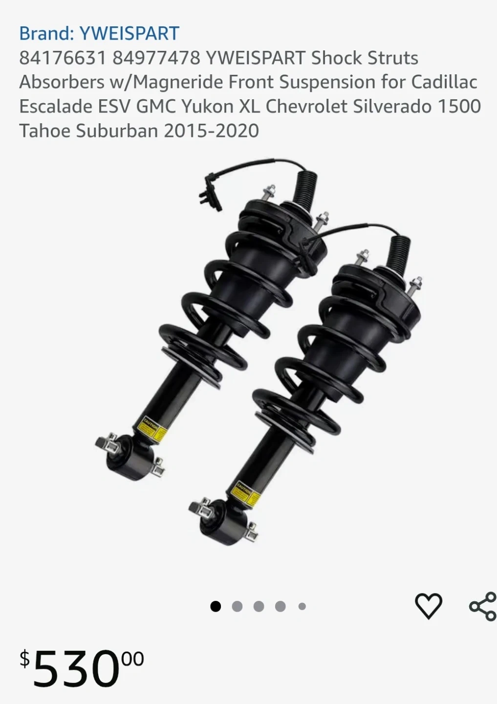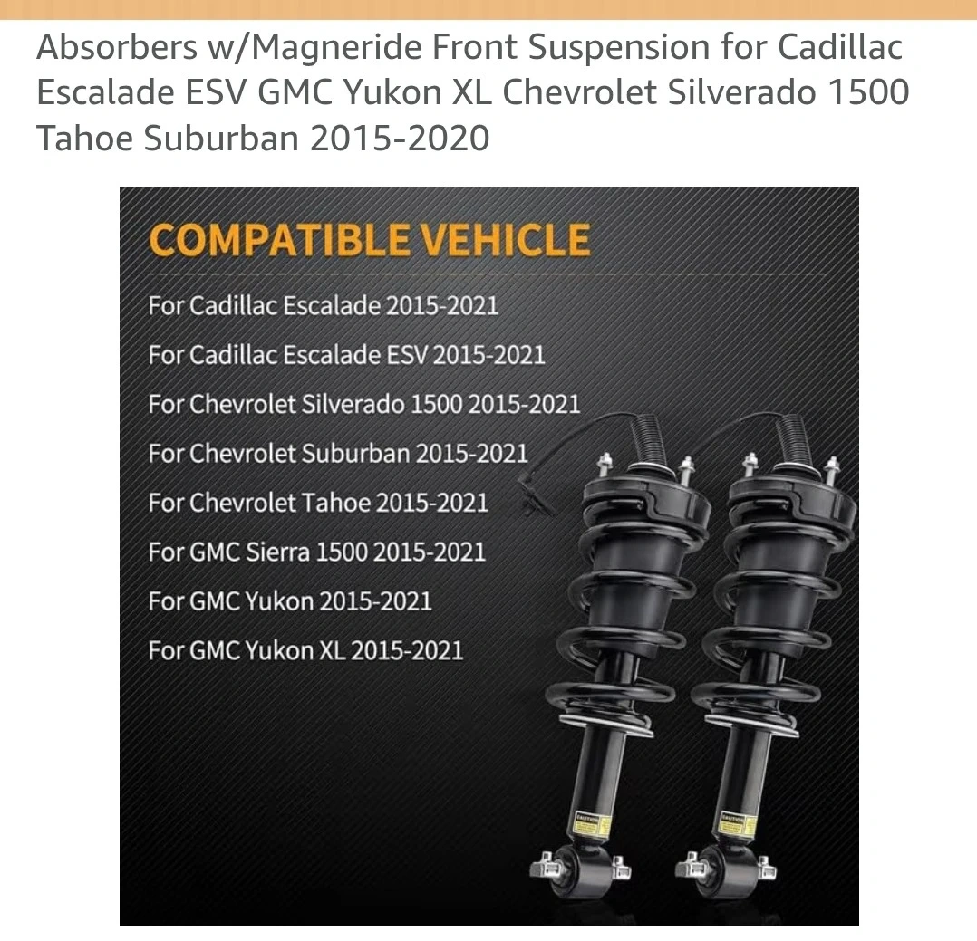 Pair of new front suspension shock struts for compatible Cadillac, GMC, and Chevrolet vehicles. These absorbers come with Magneride front suspension. They're designed for models 2015-2020.