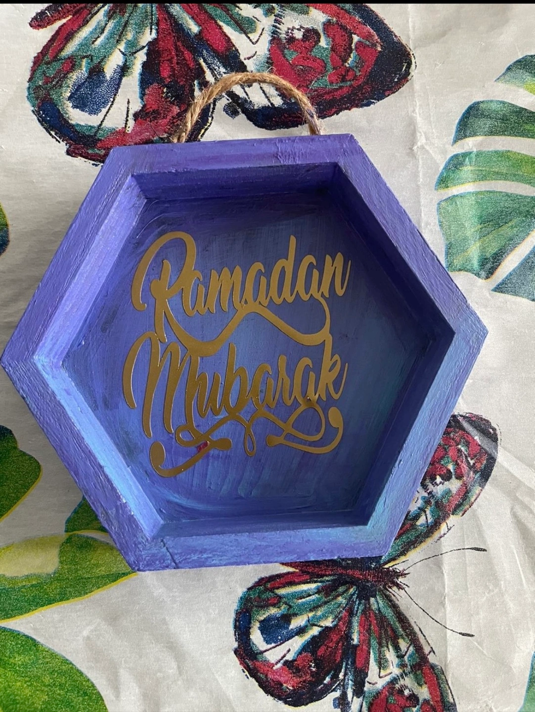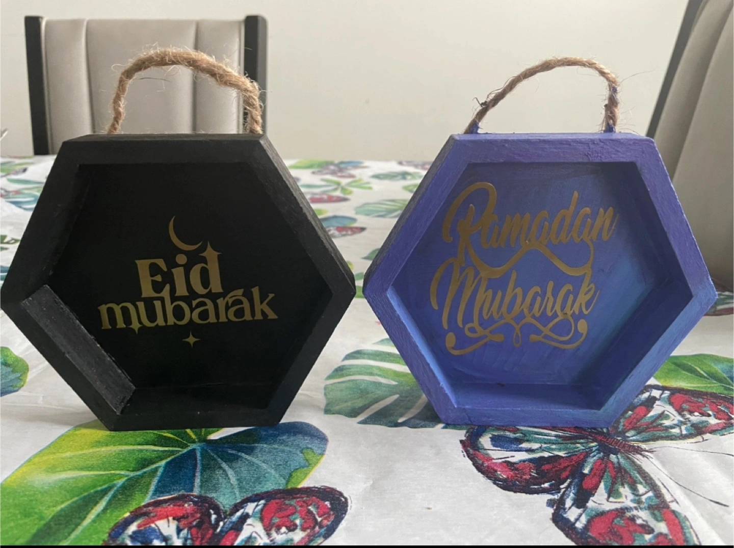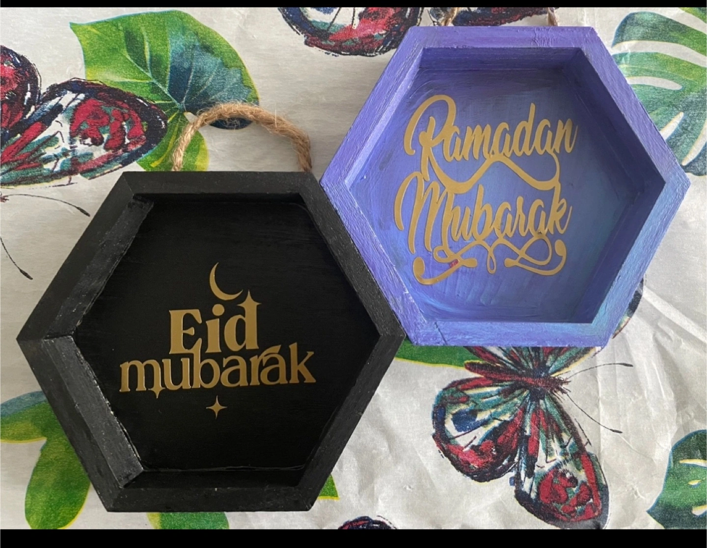 Two hexagon-shaped wooden signs. One purple, one black. Gold lettering. Ramadan Mubarak and Eid Mubarak.