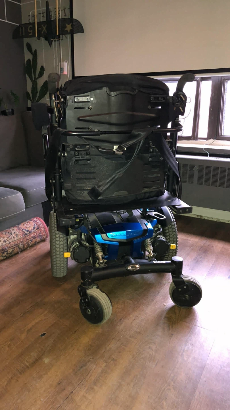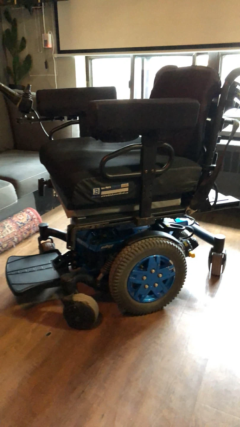 2 wheelchairs has a comfortable seat with a safety belt. The joystick control allows for easy maneuverability