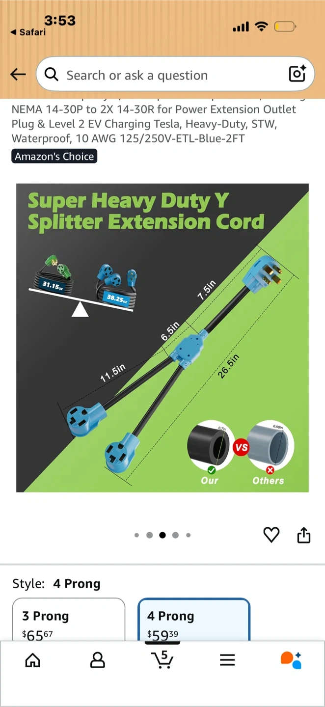 This is a NEMA 14-30P to 2x 14-30R Y splitter adapter cord. It's 2 feet long and made with 10 AWG STW wire. This cord is heavy-duty and waterproof. It's designed for power extension and EV charging.