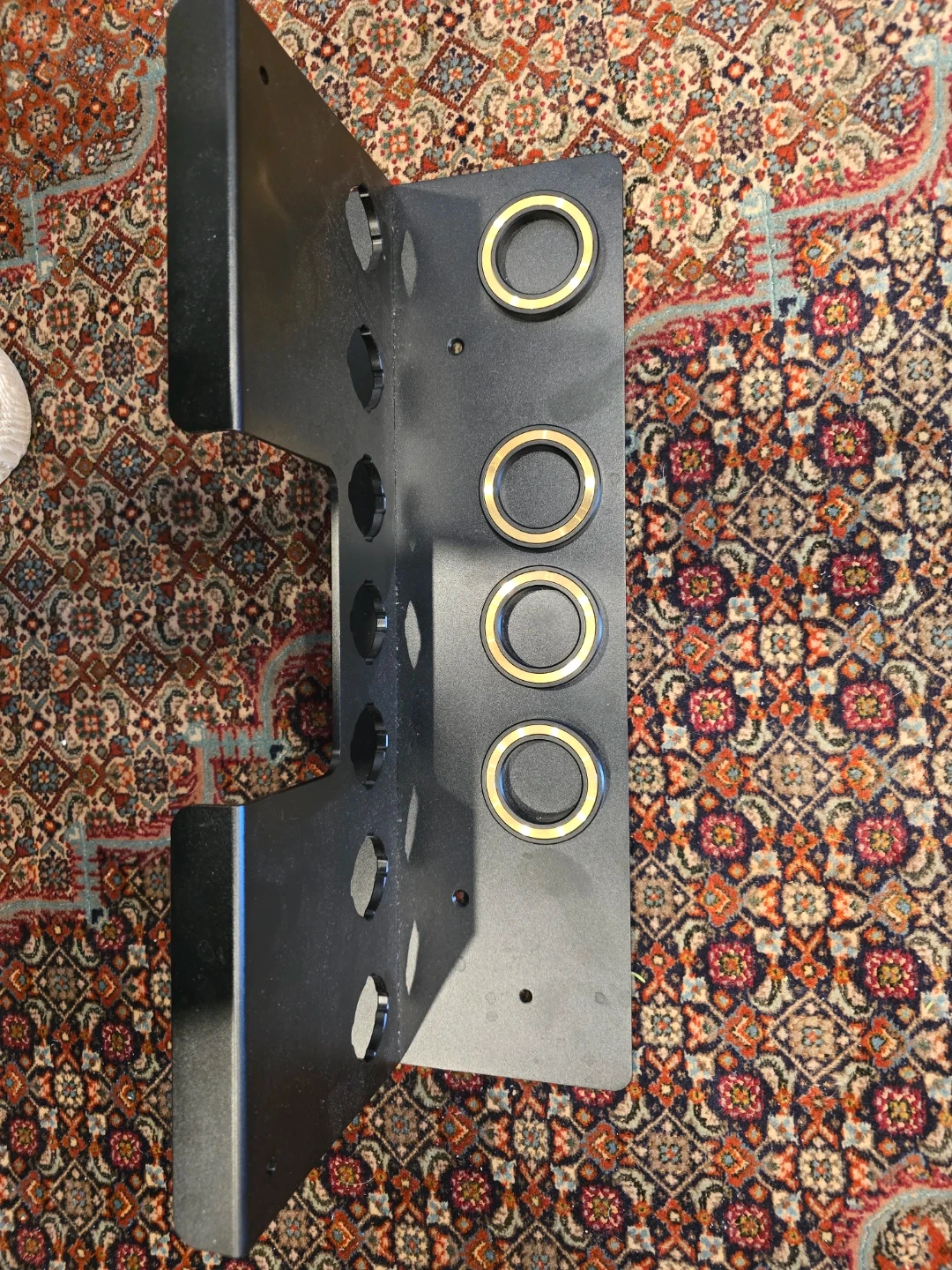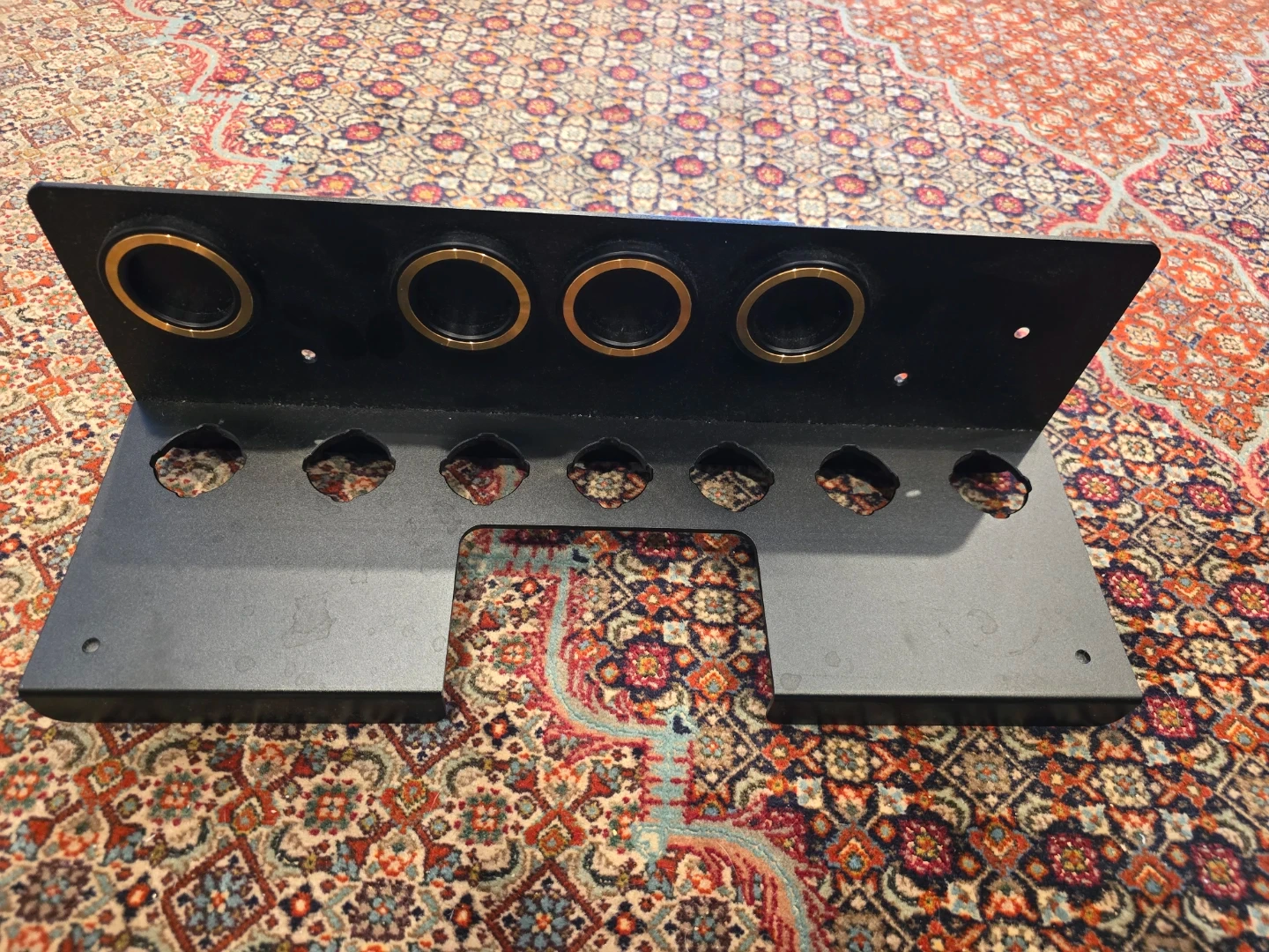 Black metal rack holder with six circular slots and six diamond-shaped slots. It has bronze-coloured rings around the circular openings. This organizer is made of metal.