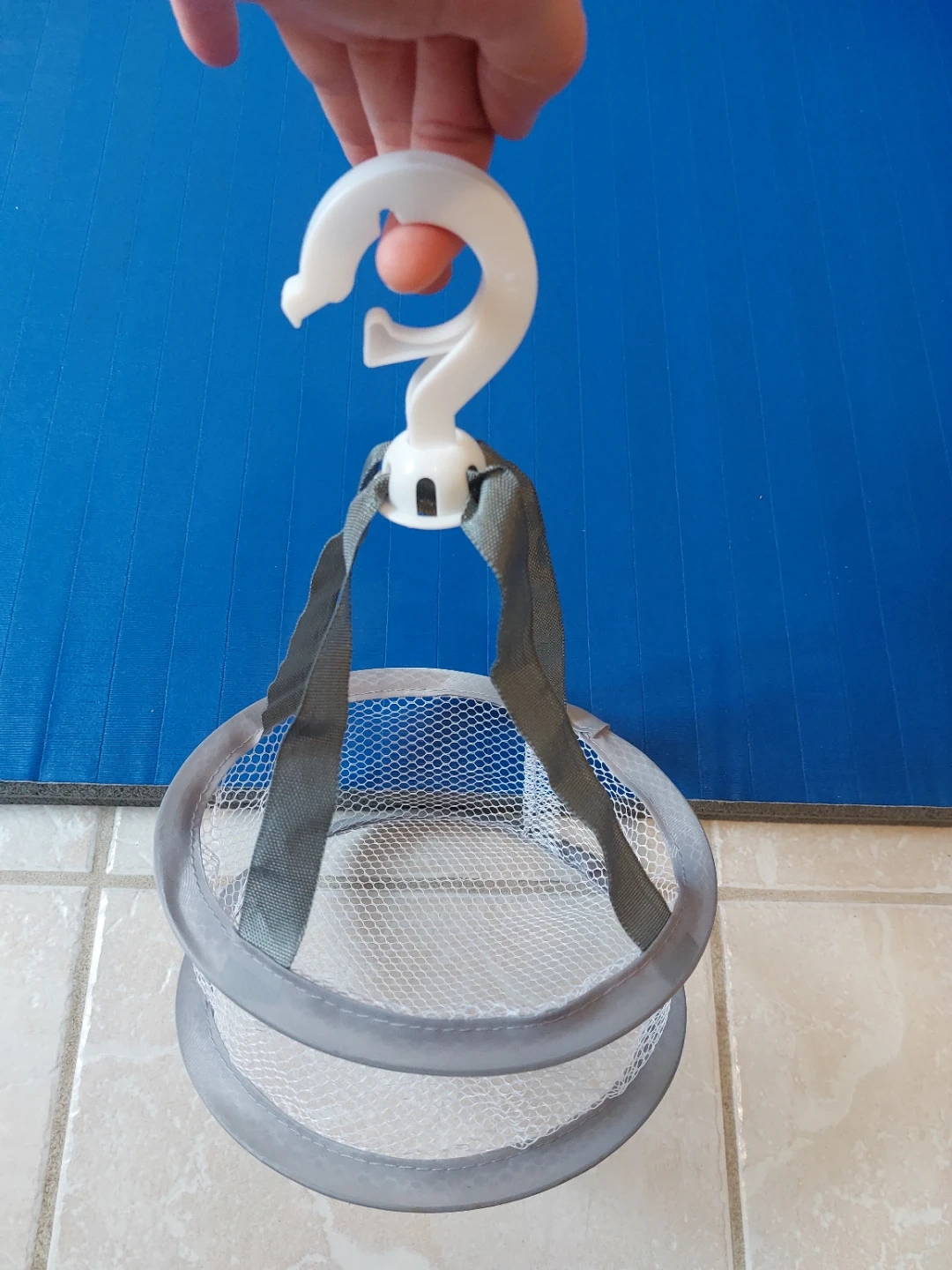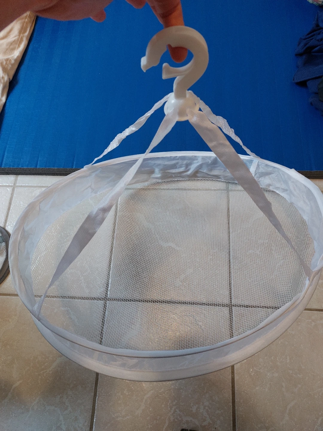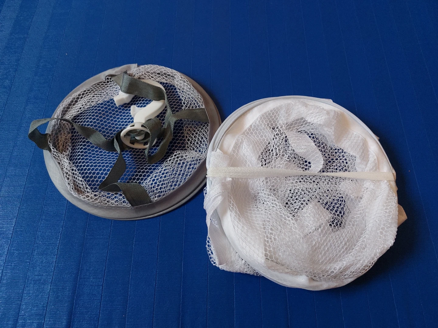 These are two hanging mesh drying hampers. One is very small, the other is collapsible. It's made of white mesh fabric with a hook for hanging. They collapse flat for easy storage. It's useful for drying delicates or small laundry items.