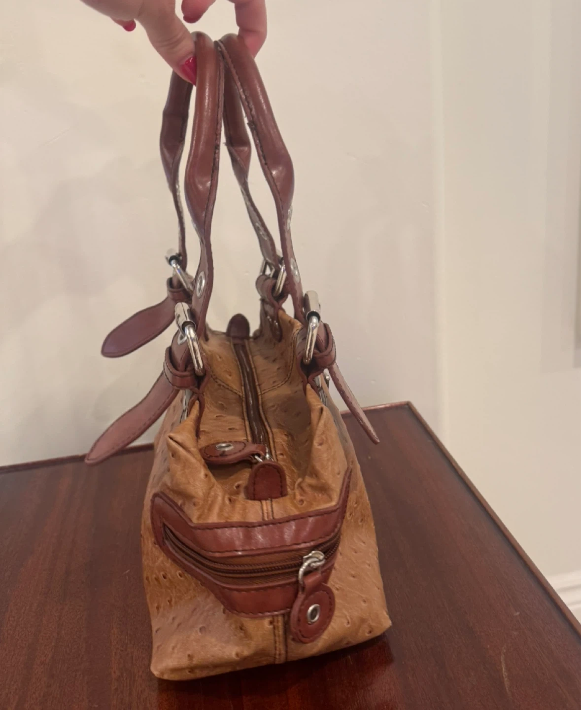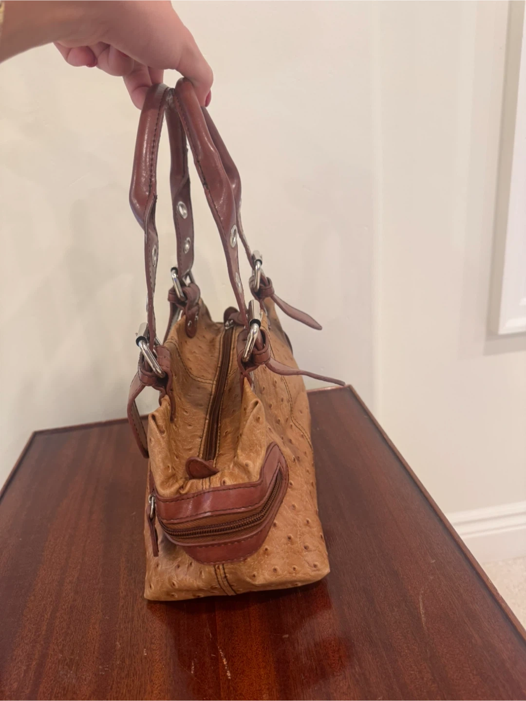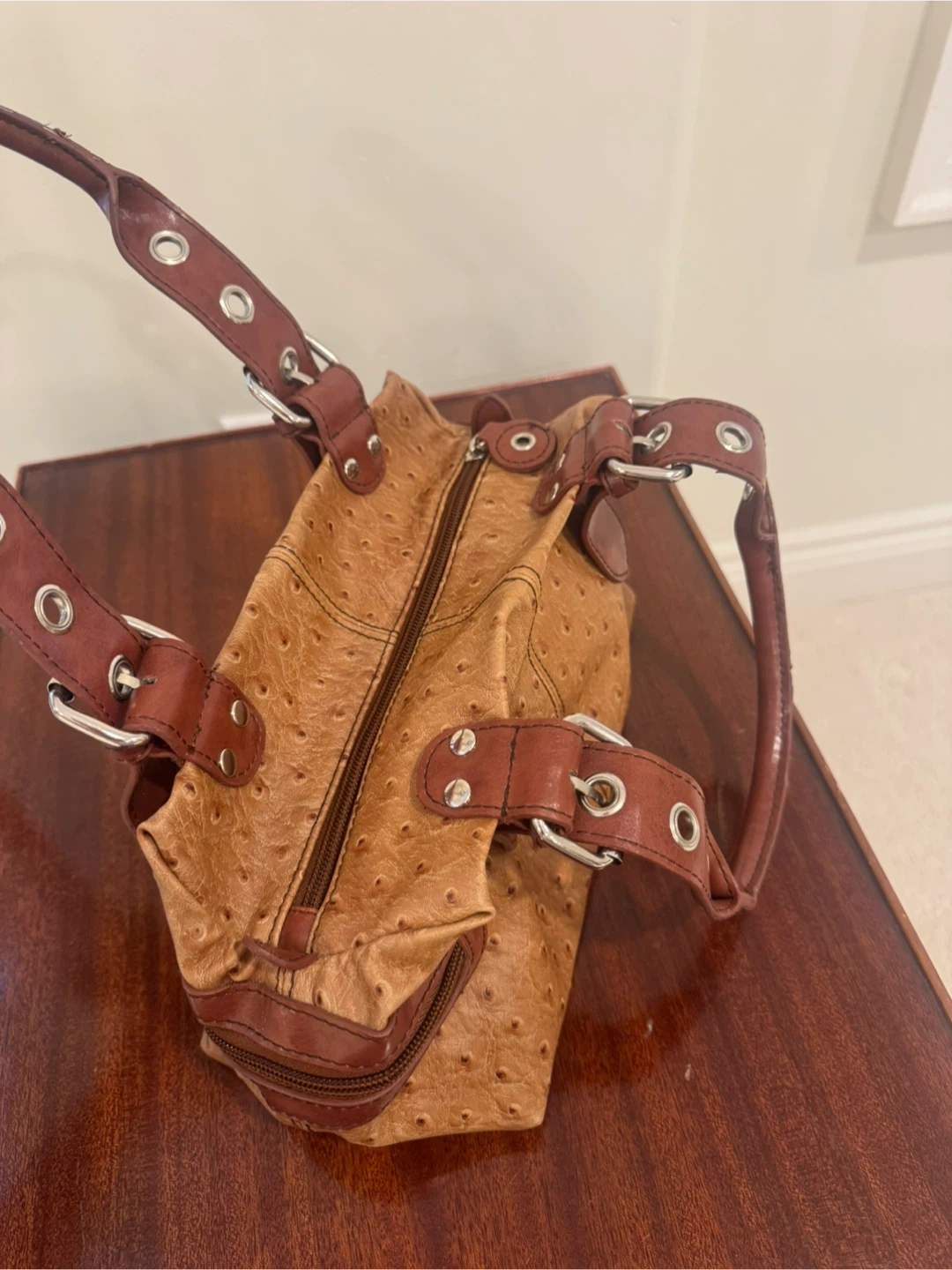 Selling an ostrich handbag in brown leather. It has a unique textured design and leather accents. Good condition barely used