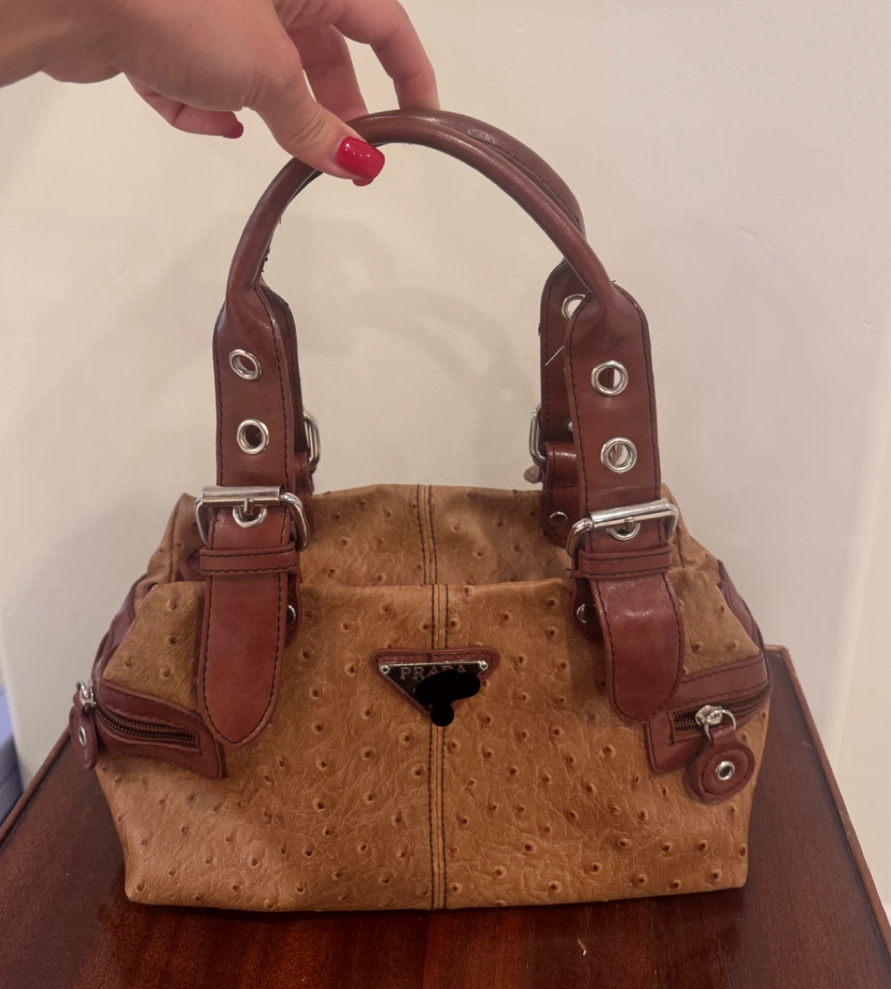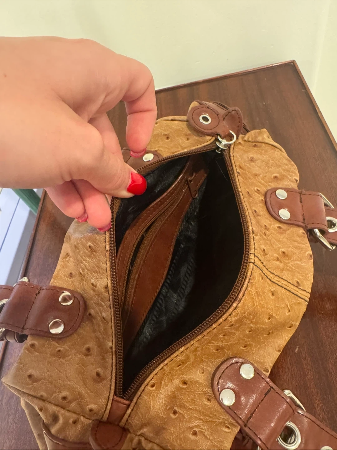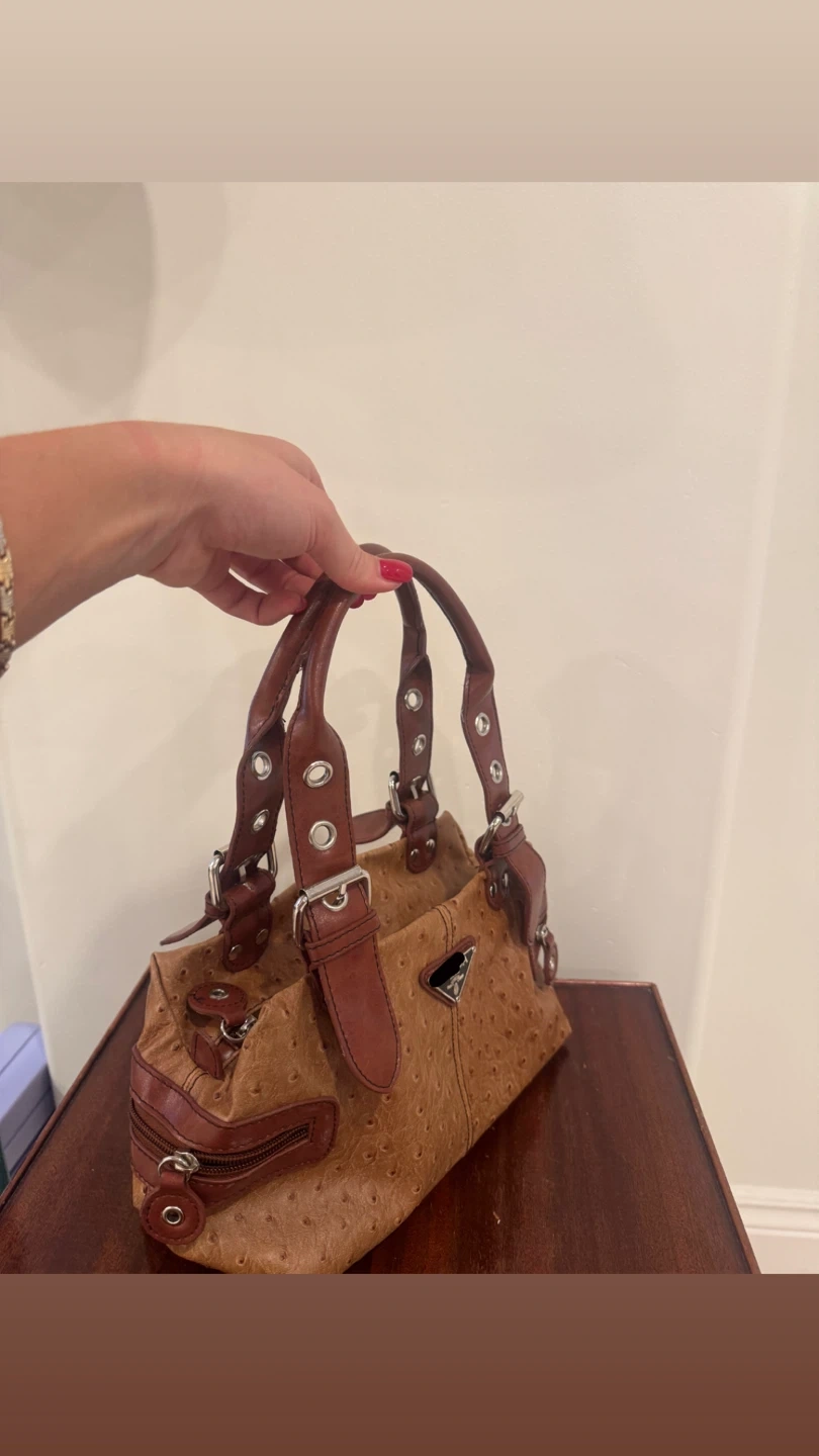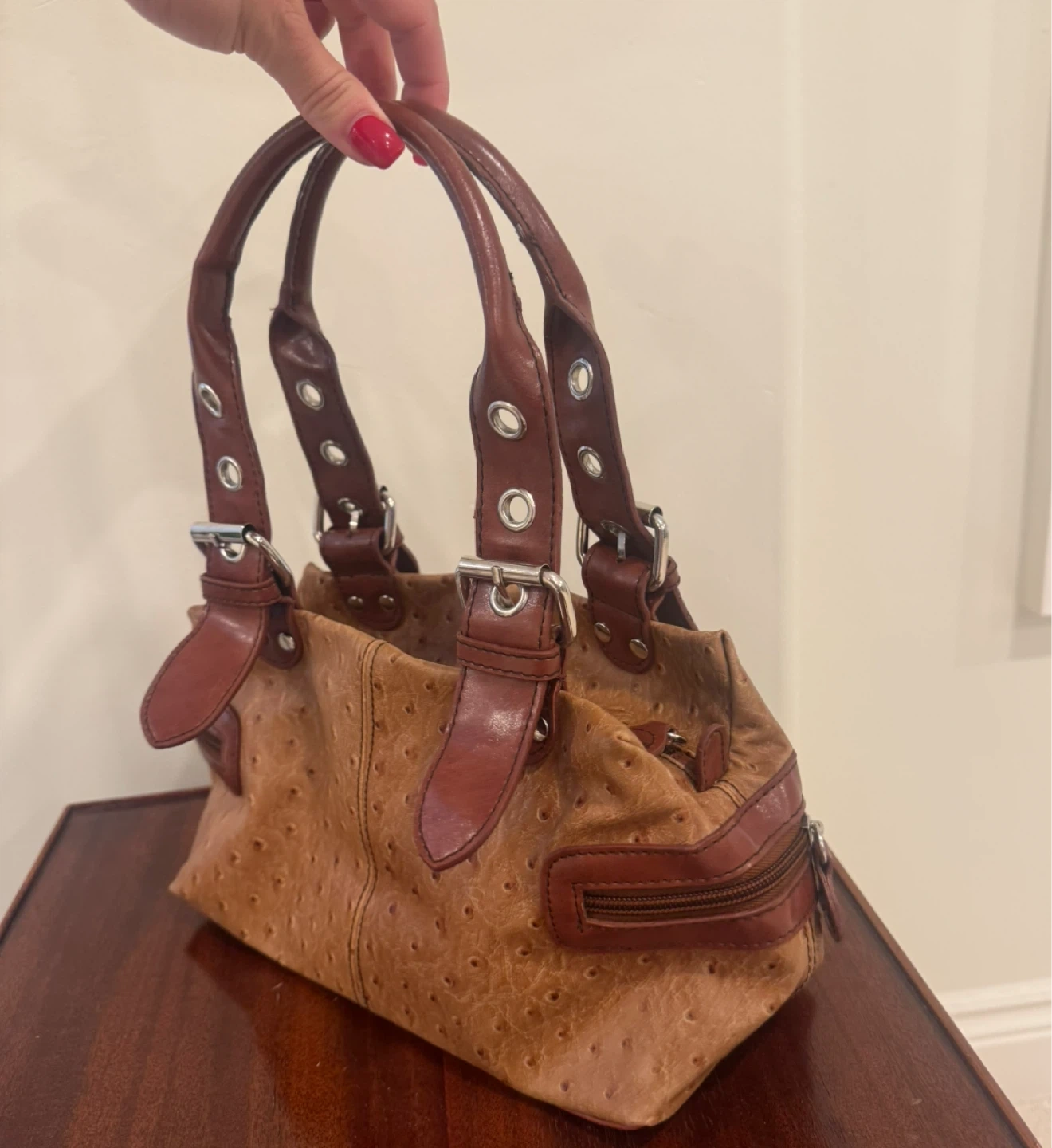 Selling an ostrich handbag in brown leather. It has a unique textured design and leather accents. Good condition barely used