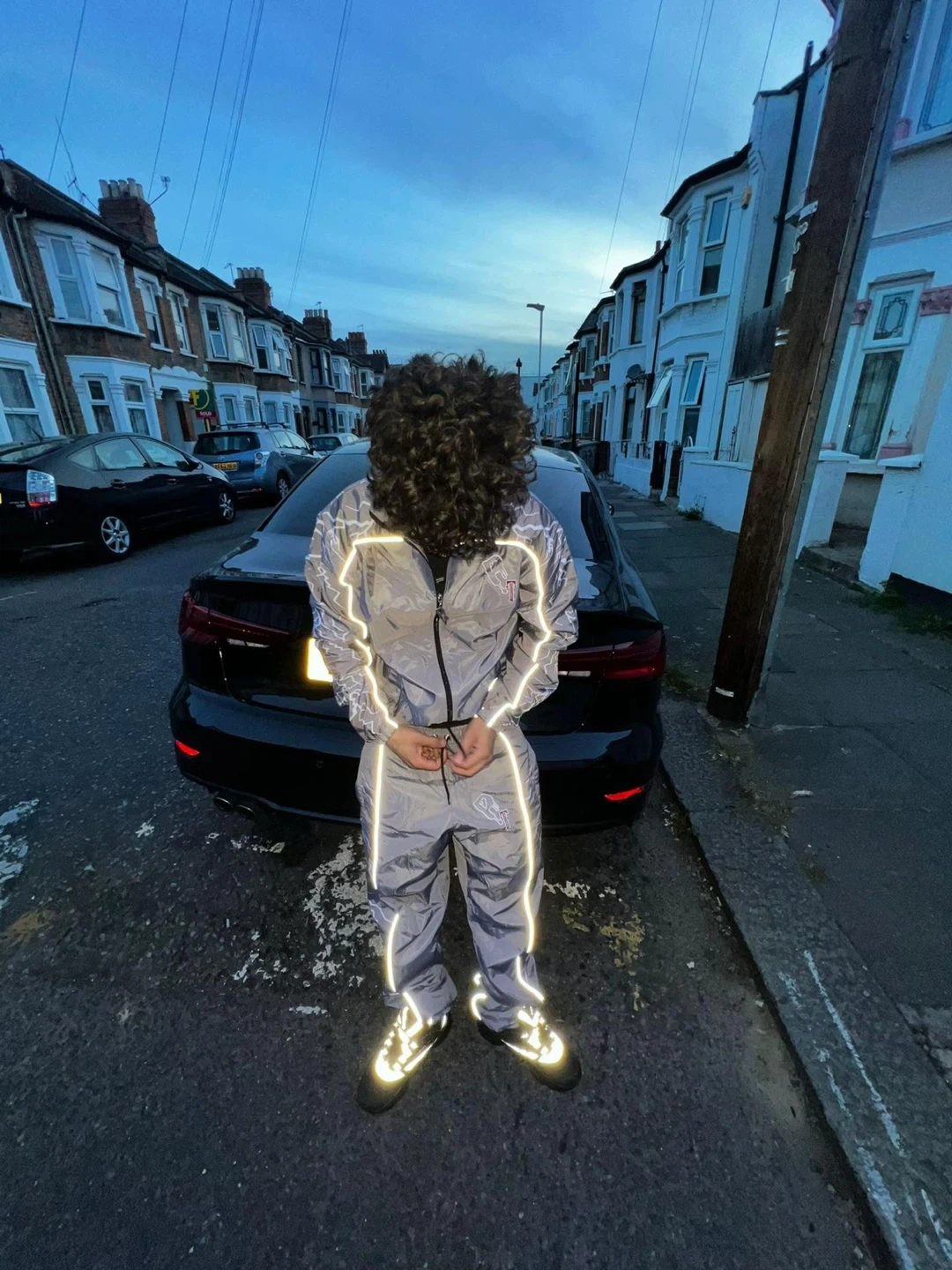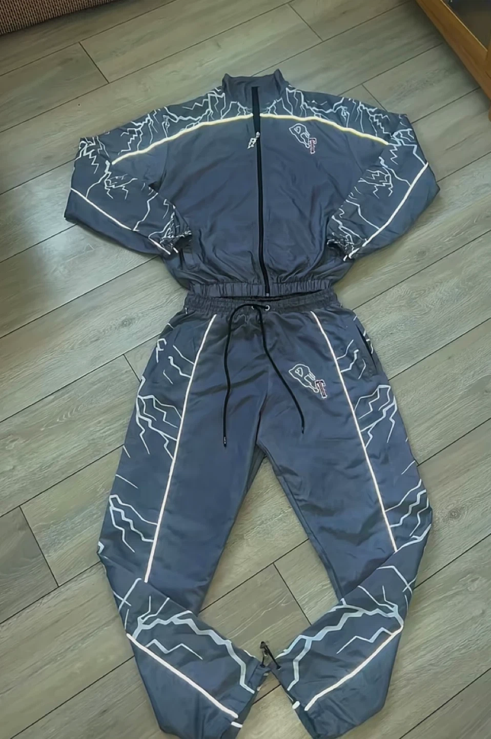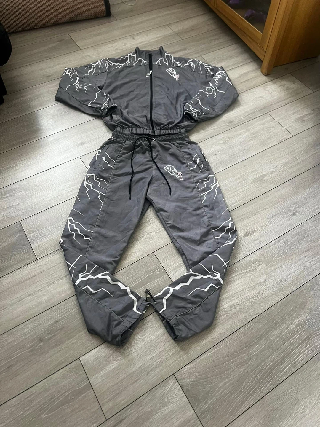 60Selling a grey tracksuit with a cool lightning design! This set includes both the jacket and pants. It's in great condition and perfect for casual wear or workouts. The material is lightweight and comfortable, great for all seasons!