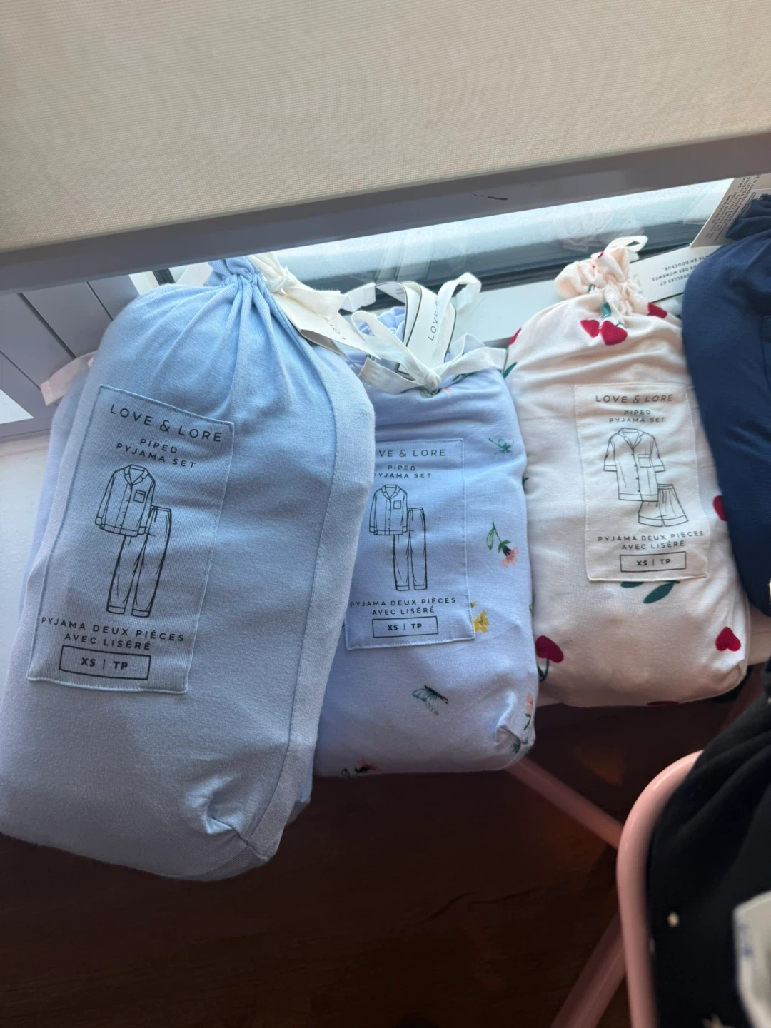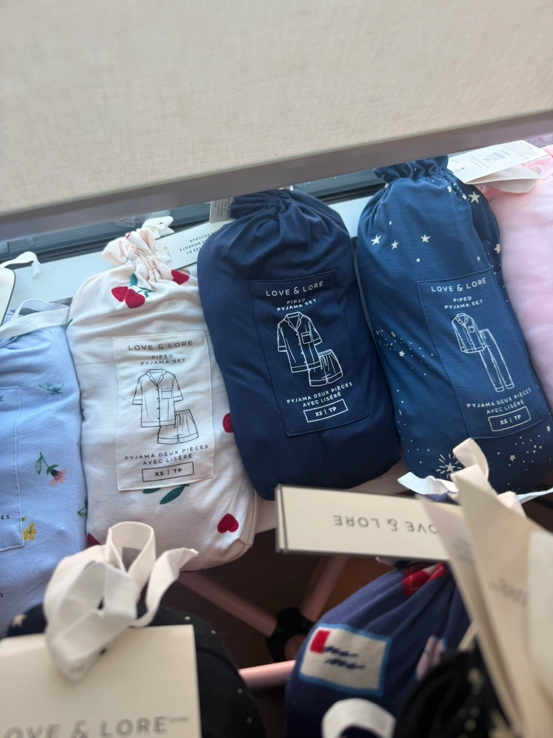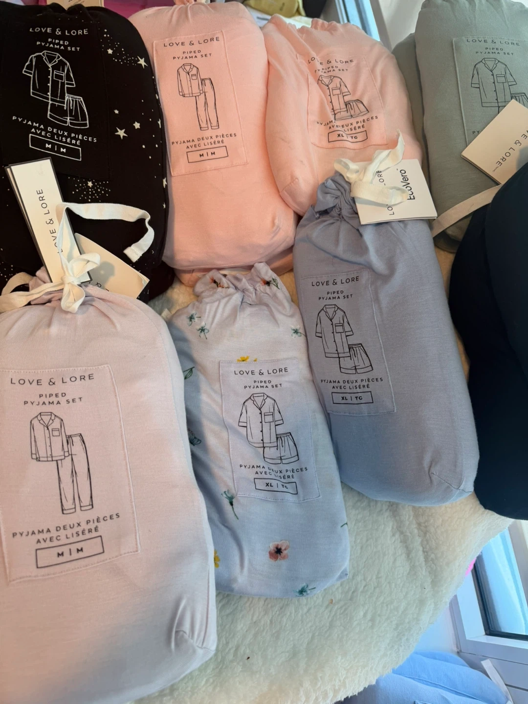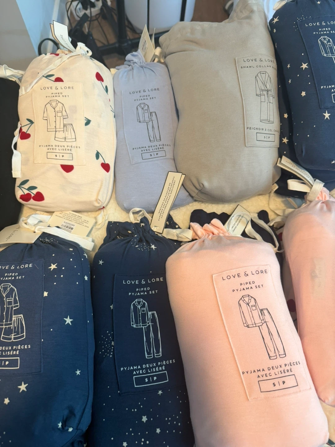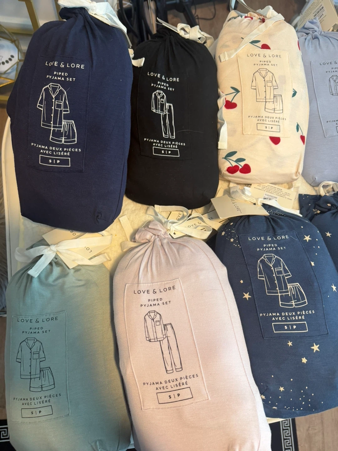 This Love & Lore pyjama set features a classic piped design. It includes a button-up top and matching bottoms, perfect for lounging. Available in various prints and sizes.