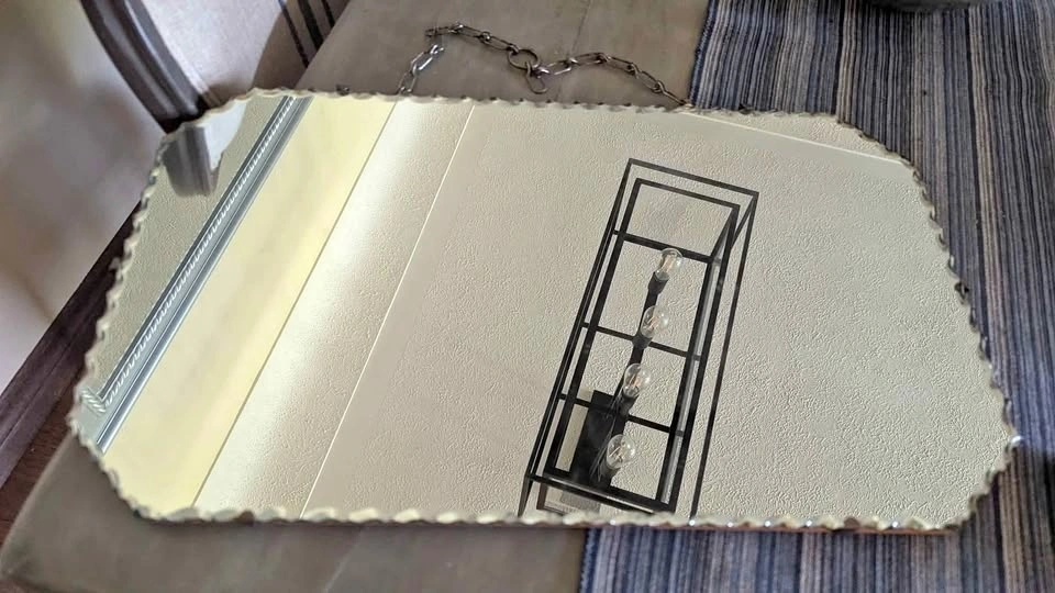 Gorgeous scalloped edge vintage mirror, heavy weight on wood backing with chain for hanging. In very good condition. 22x13 inches. Asking $40. Pickup in Grimsby. Check out my other listings!