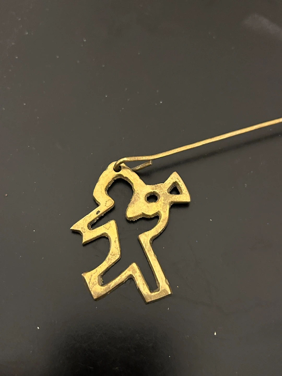 A unique vintage brass candle snuffer featuring a charming stylized figural handle and long slender arm. The design has a wonderful mid-century modern feel with clean lines and a minimalist silhouette, while the solid brass construction gives it warmth and character.