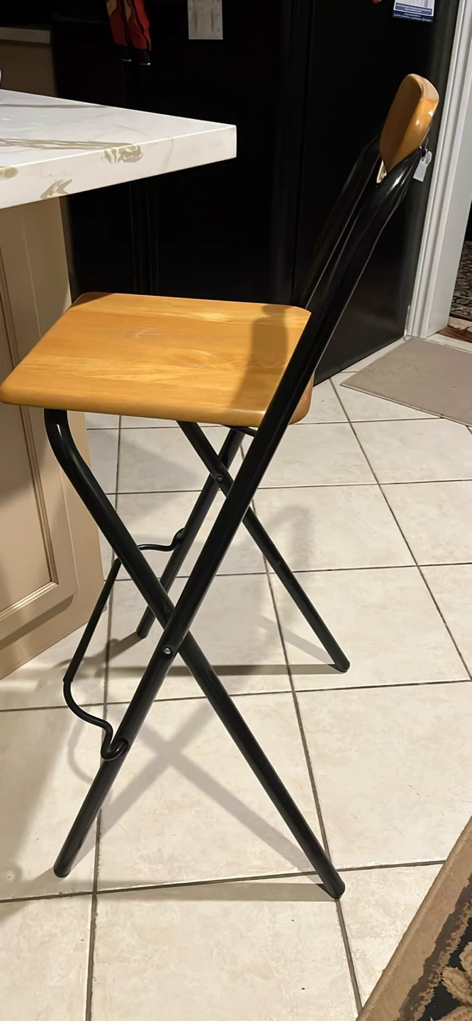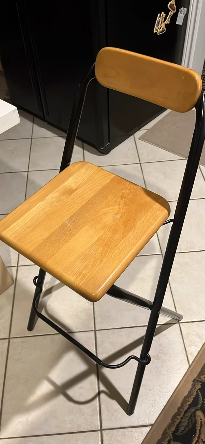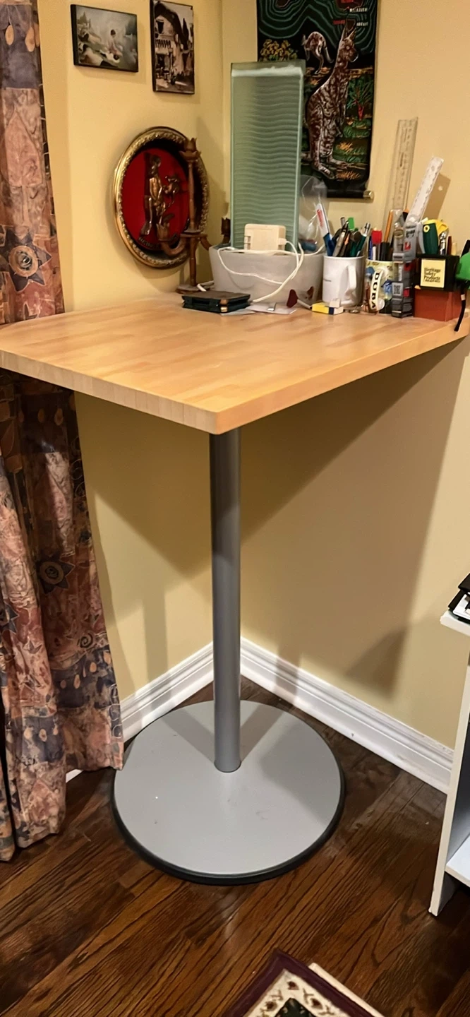 IKEA high wooden table (HxBxW) (42.5”x 23.5”x 27.5”) with steel frame and 2 IKEA Stools with wooden seats and steel frame. Price for all 3: $70. Ideal as a breakfast table.