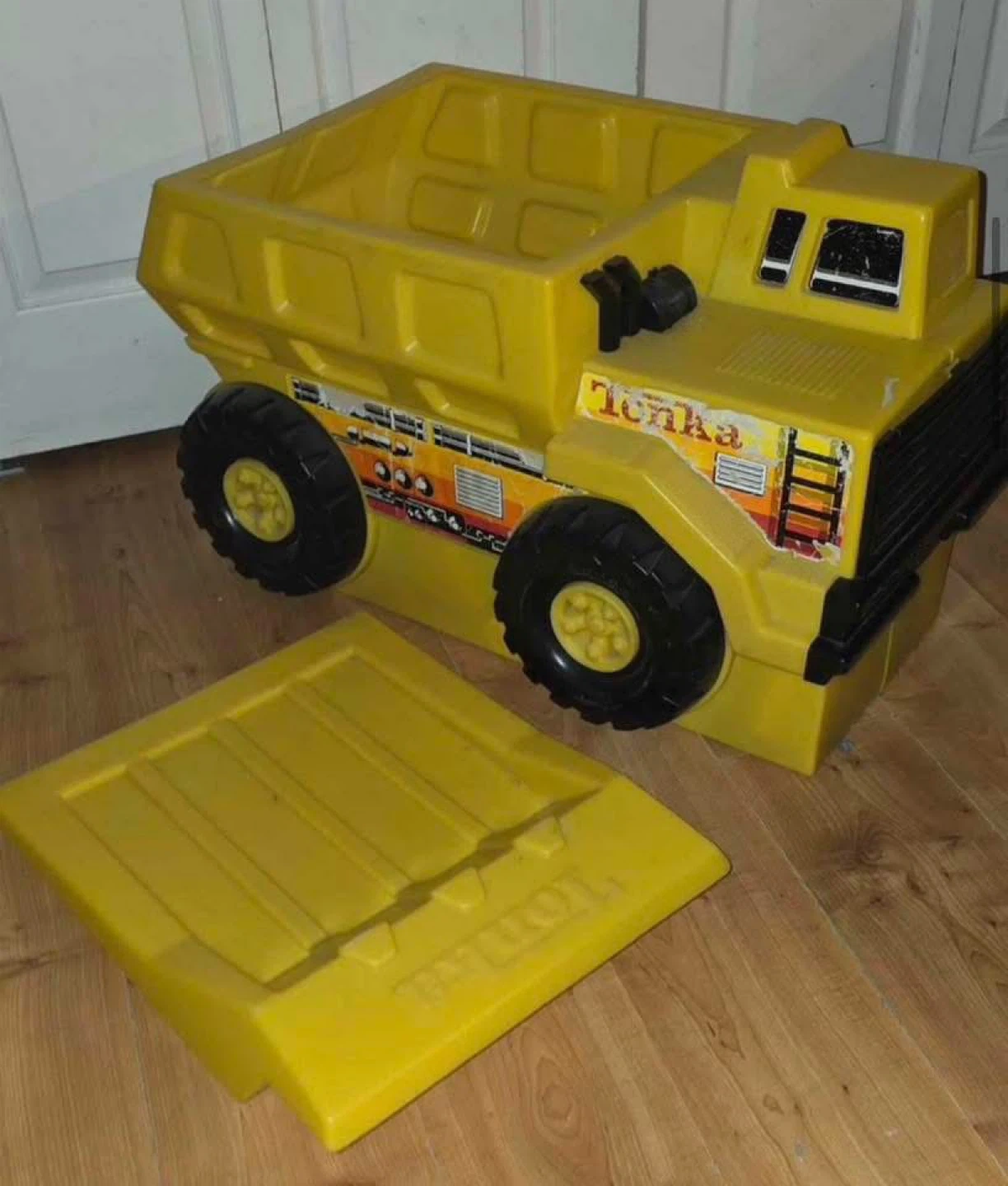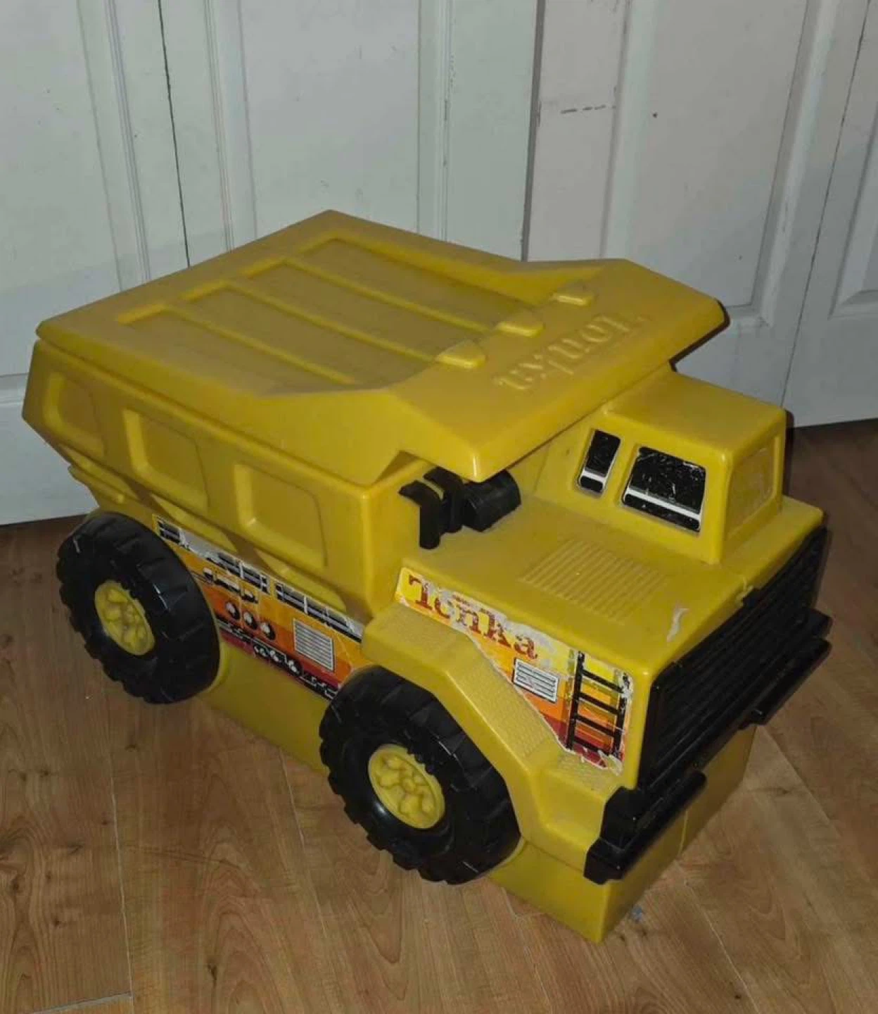 This is a Tonka dump truck toy. It's yellow and functions as a storage box. The lid is removable, and it has a large compartment inside. This would be great for organizing toys!
