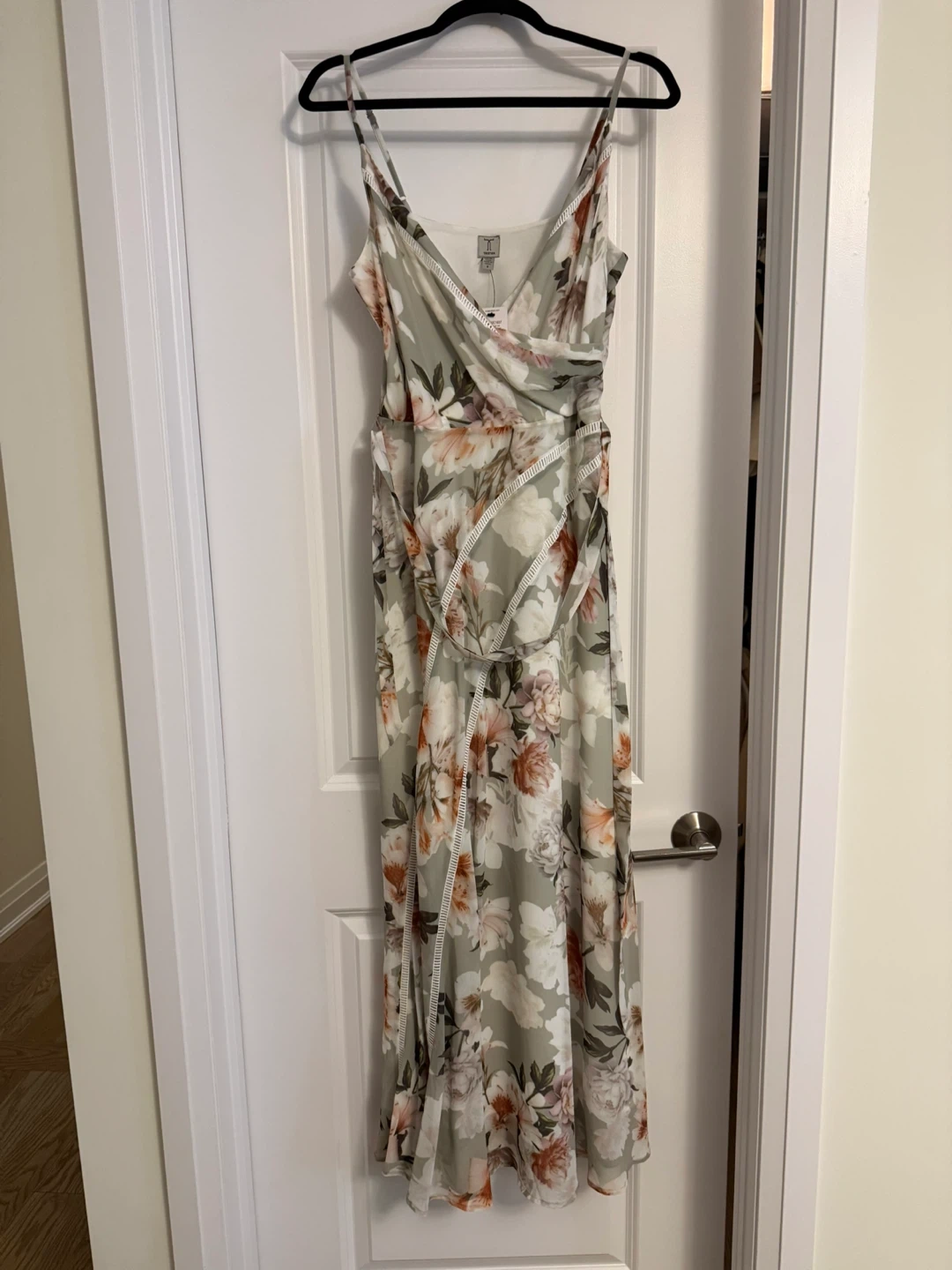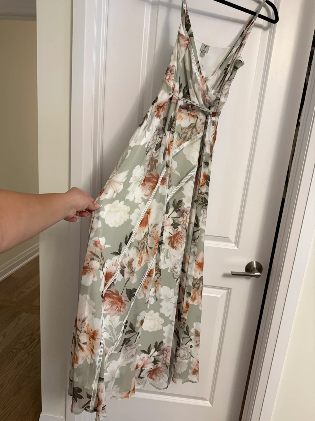 This Tristan maxi dress features a beautiful floral print with a sage green base and coral and white accents. It has a flattering V-neckline, adjustable spaghetti straps, and a tie waist. The fabric is lightweight and flowing, with a lace trim detail along the skirt. Size is 8.