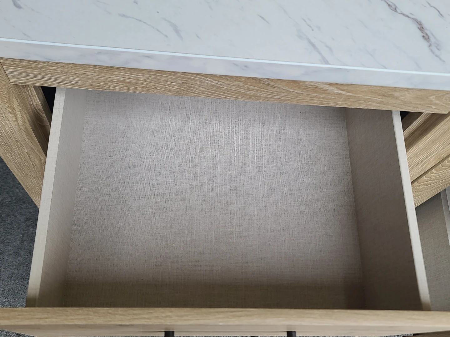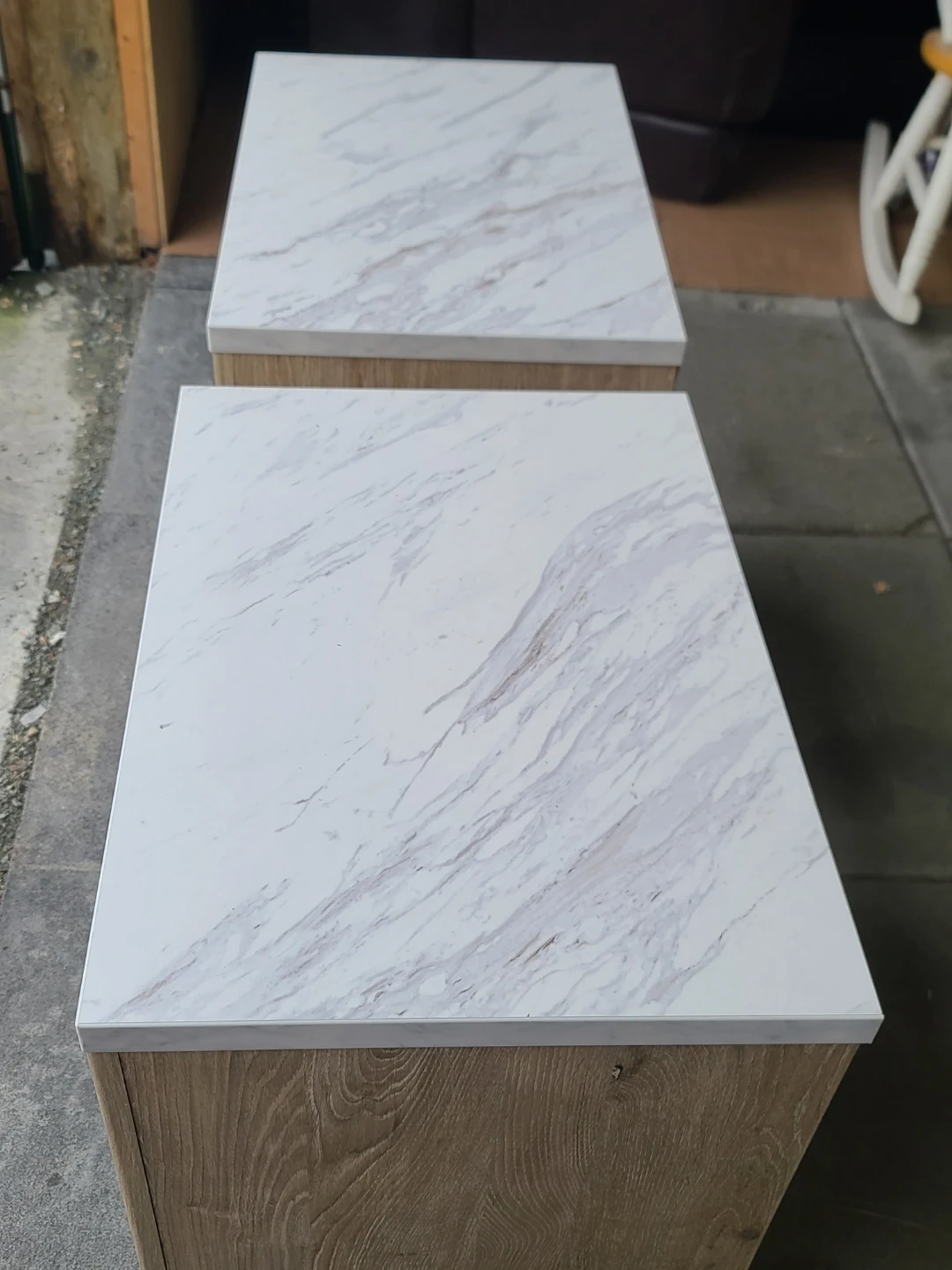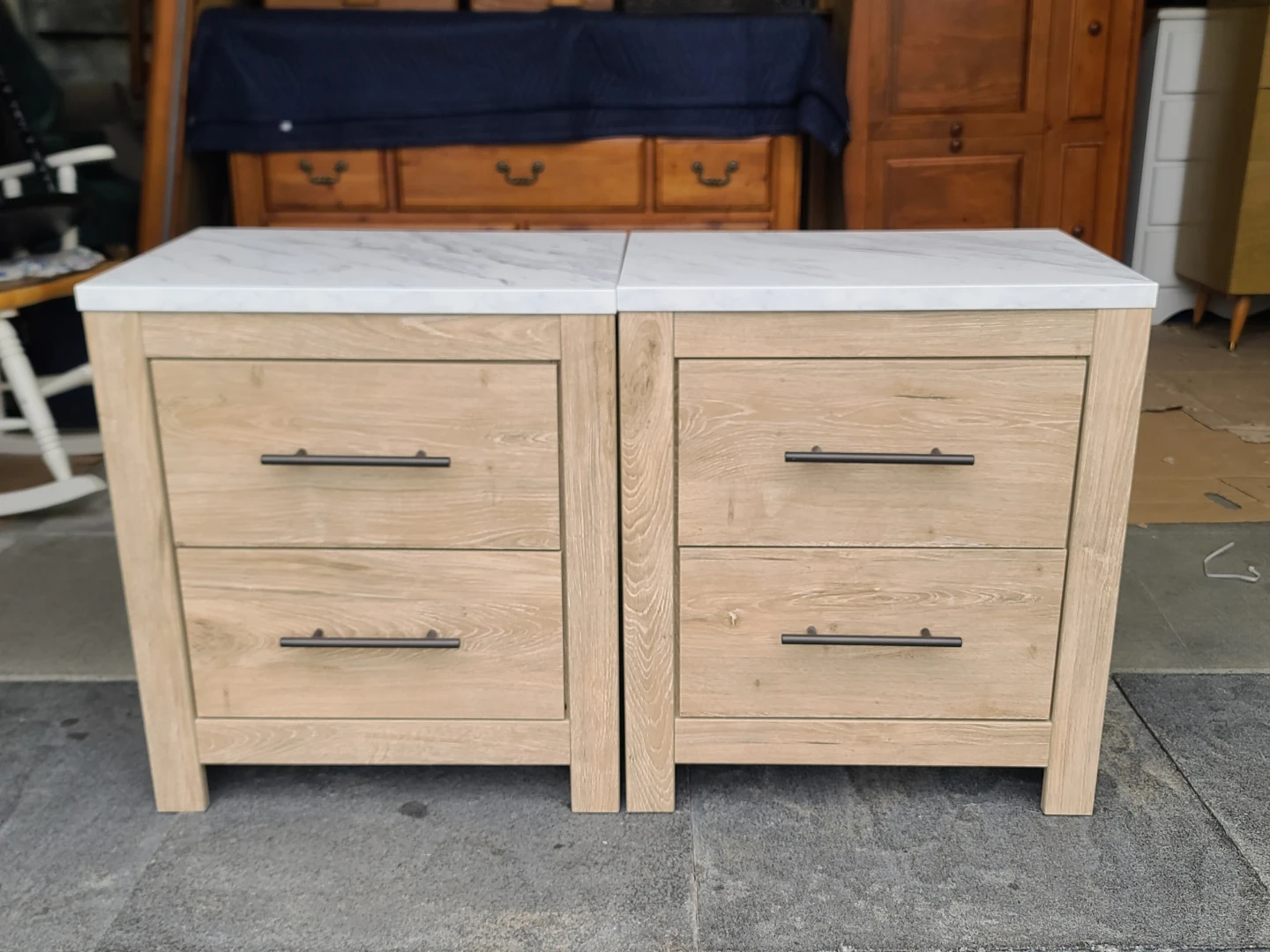 Two matching nightstands with light wood grain finish and white marble-look tops by Ashley Furniture. Each unit has two drawers with black handles. Drawer interiors are light coloured. Measurements: 22" across the front by 16" deep by 25" high. Delivery can be arranged. Viewing and pickup by appointment.