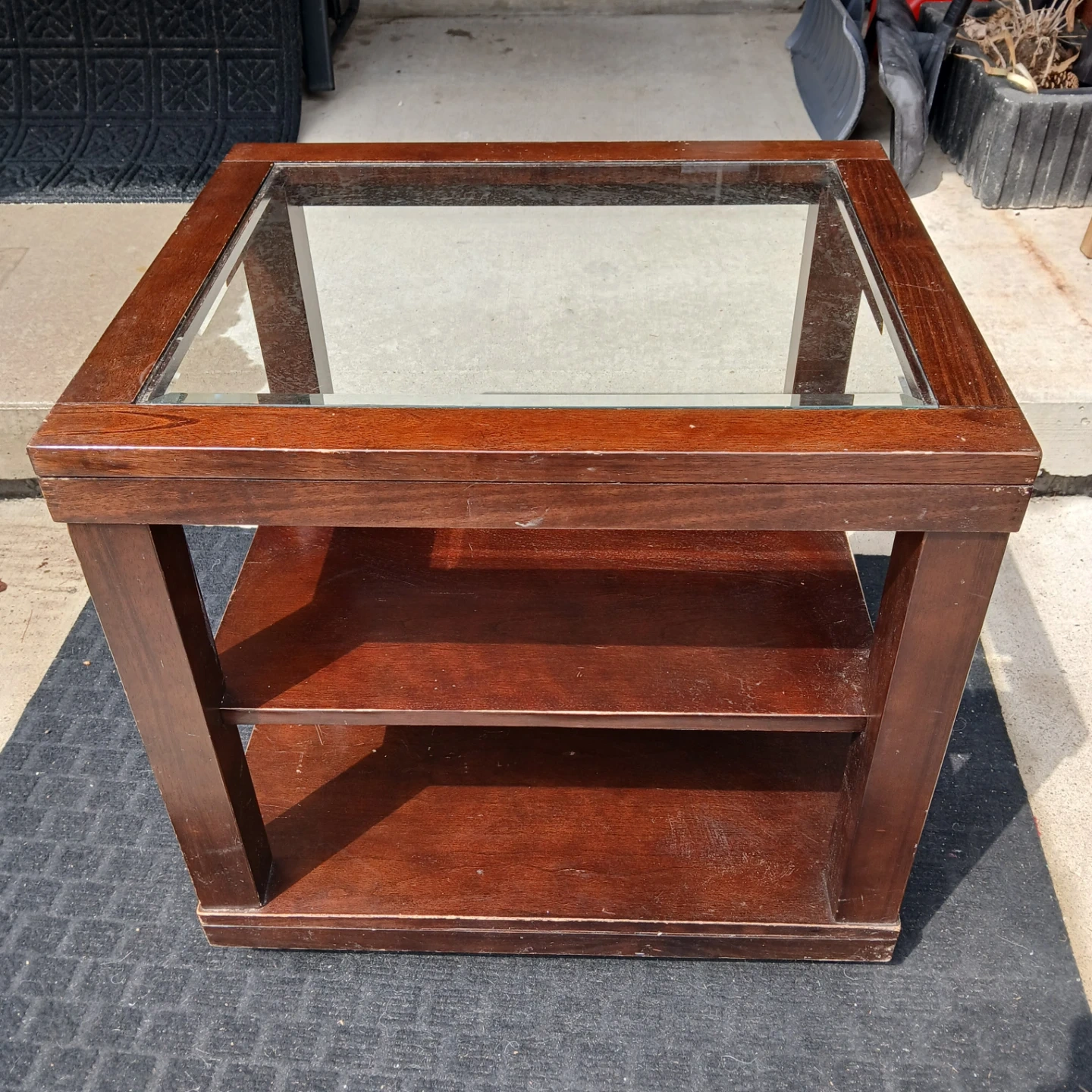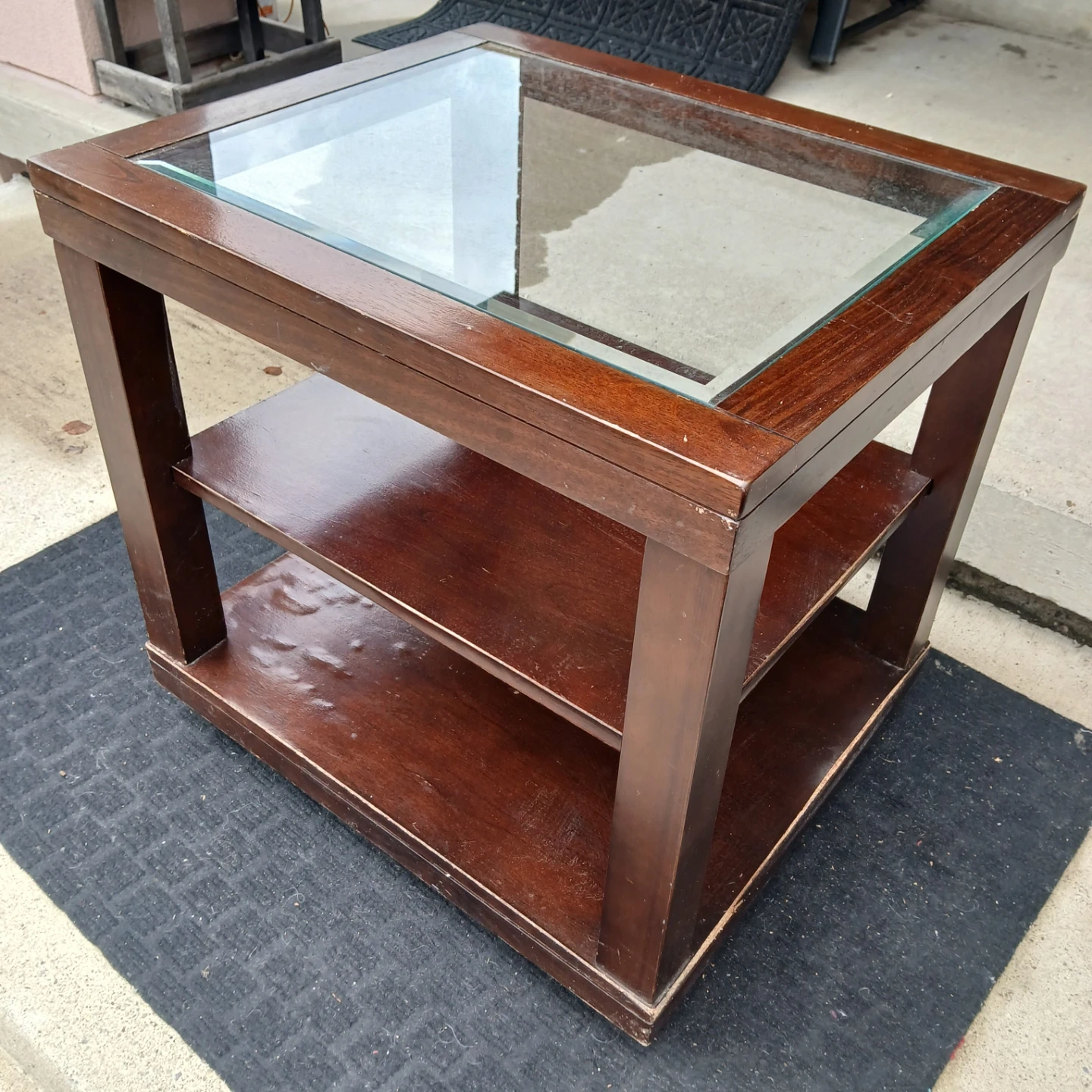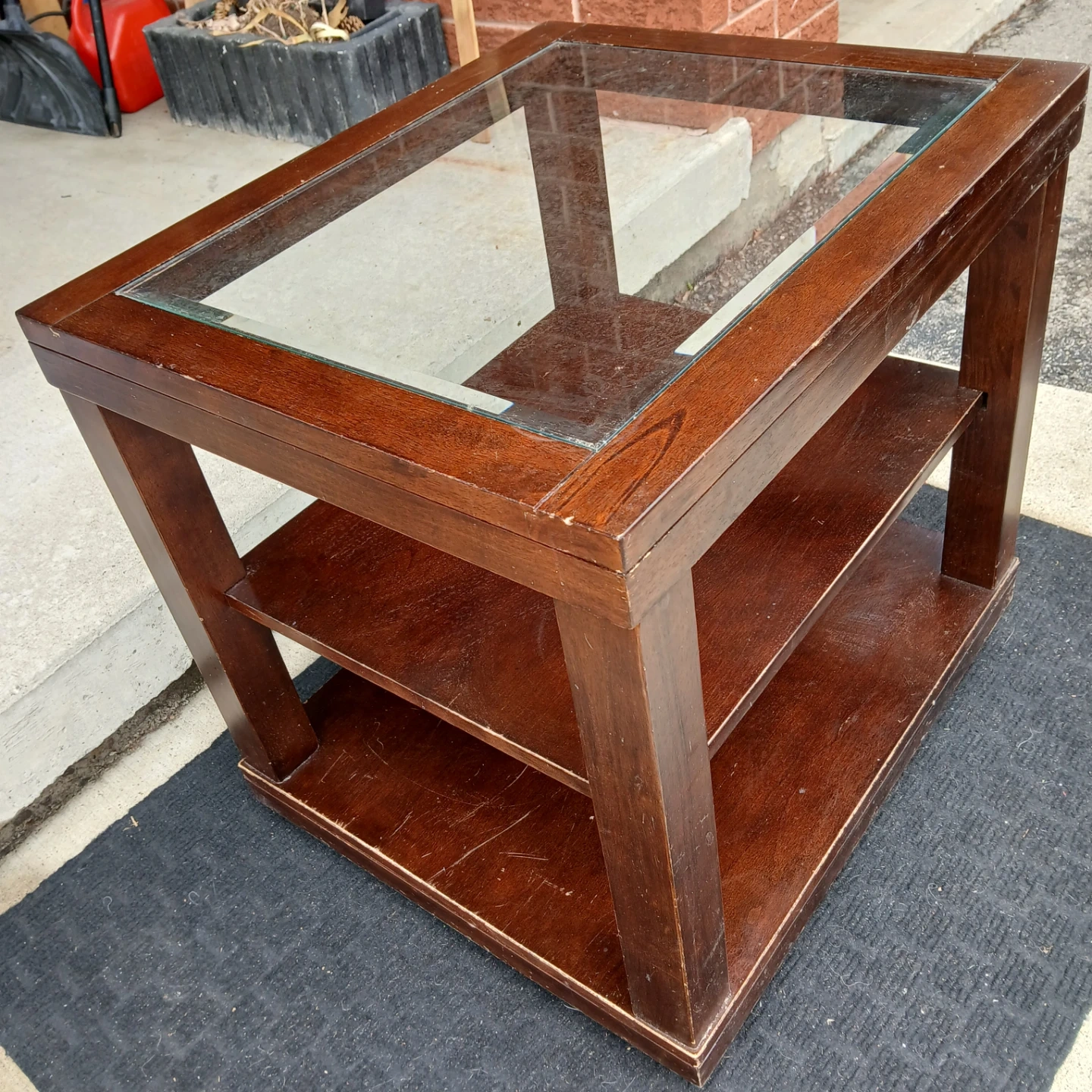 A dark brown wooden end table featuring a glass top and two lower shelves. Good condition. It's a compact size, perfect for placing beside a couch or armchair. This table offers practical storage and a stylish look for any living space. Dimensions: L 26" X W 22" X 25.5". Great for home or cottage.