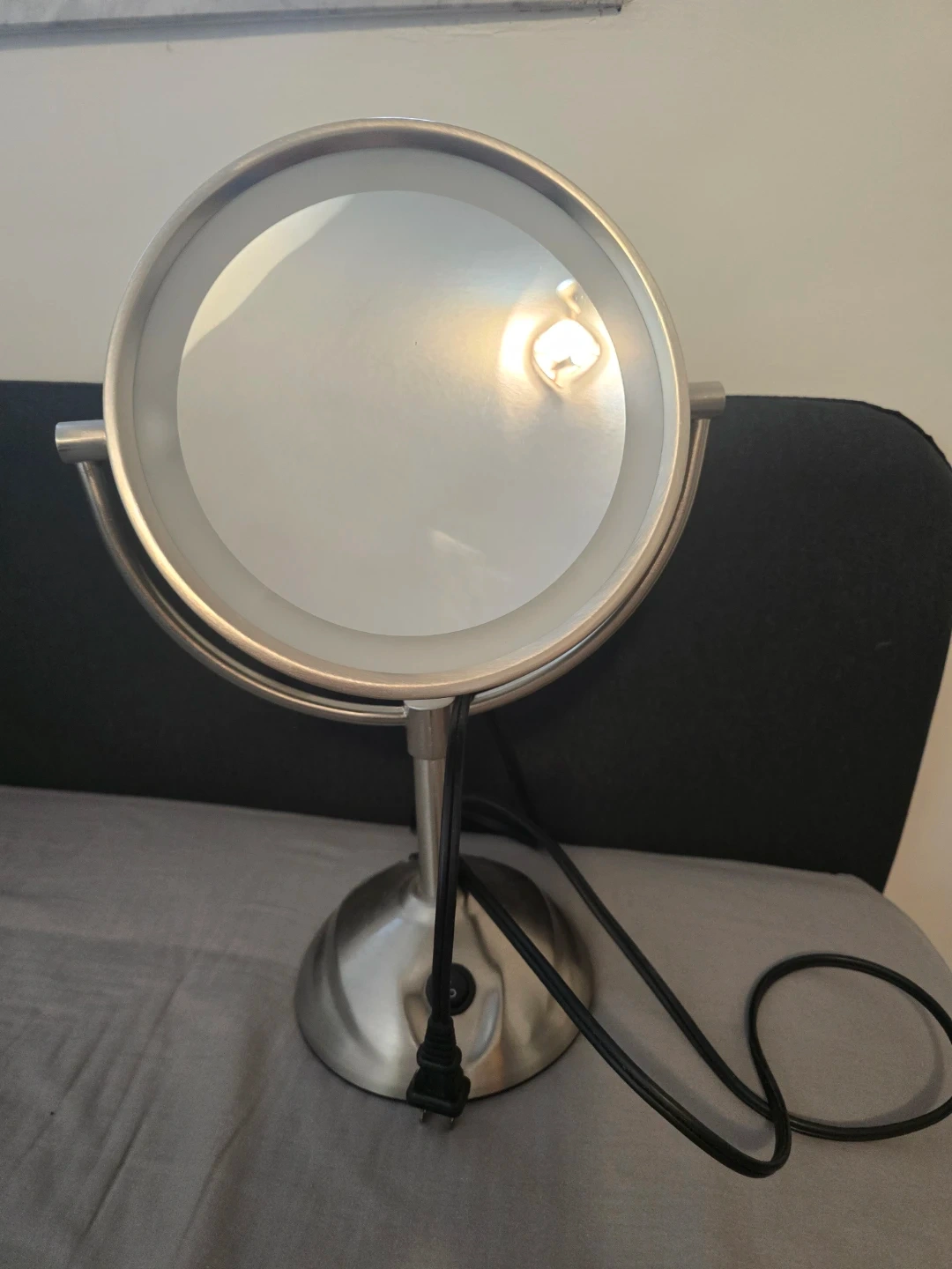 Stylish double-sided makeup mirror with bright LED lighting. Perfect for makeup, skincare, and grooming.