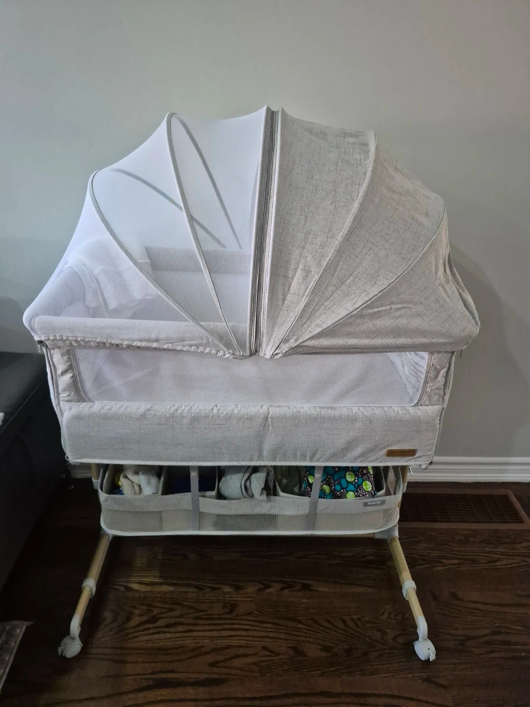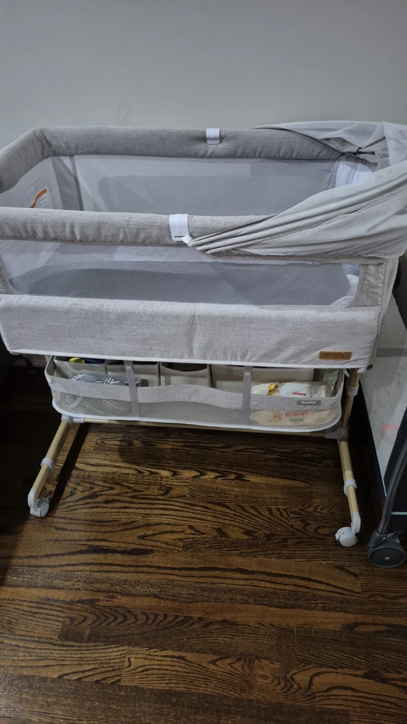 This bedside bassinet offers convenience for parents. It features a mesh side for visibility and a storage organizer underneath. The height is adjustable from 30.9" to 39.37". It's easy to move with wheels.