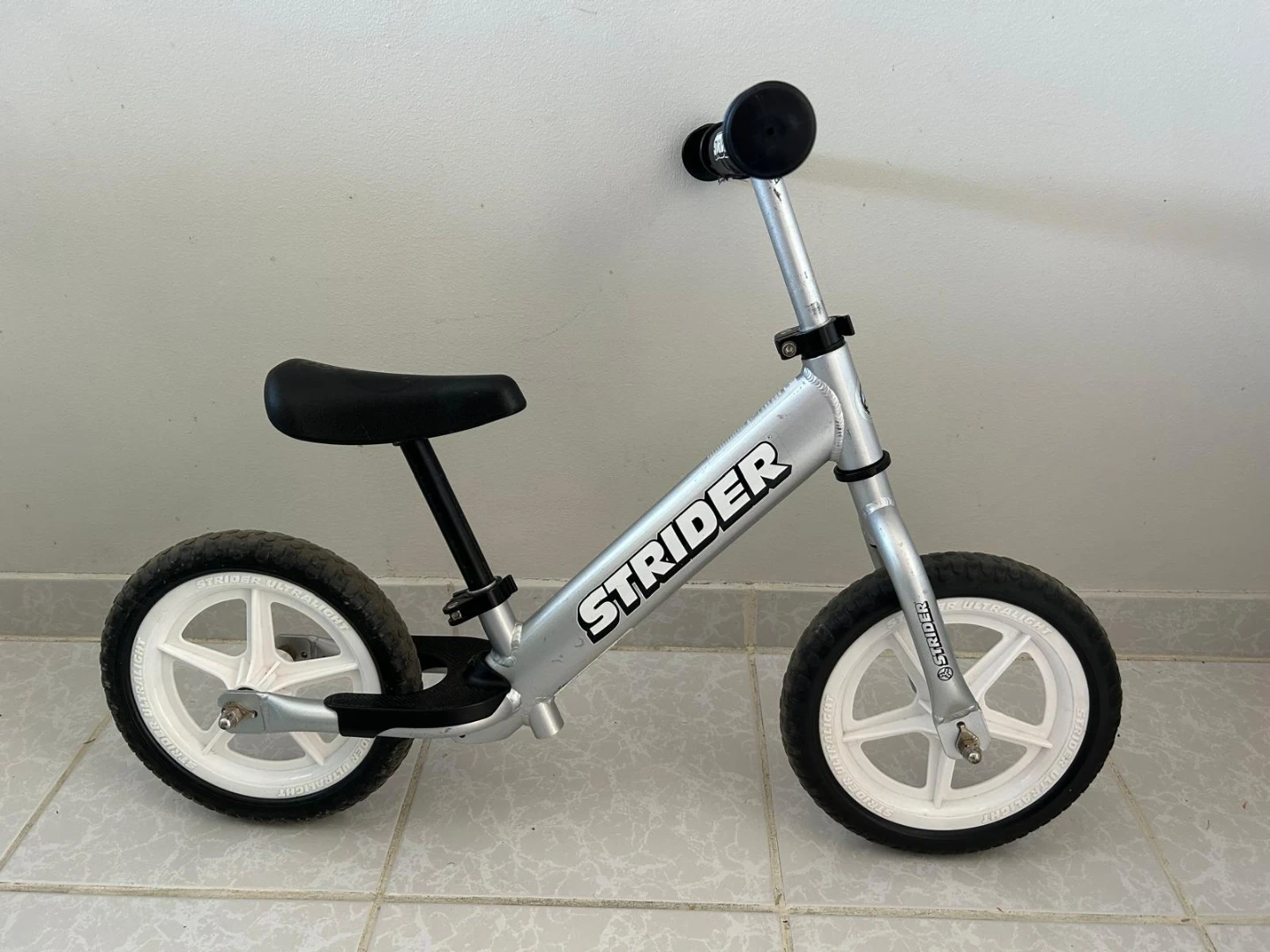 This is a silver Strider balance bike. It features white wheels and black handlebars and seat. It's great for teaching kids balance!