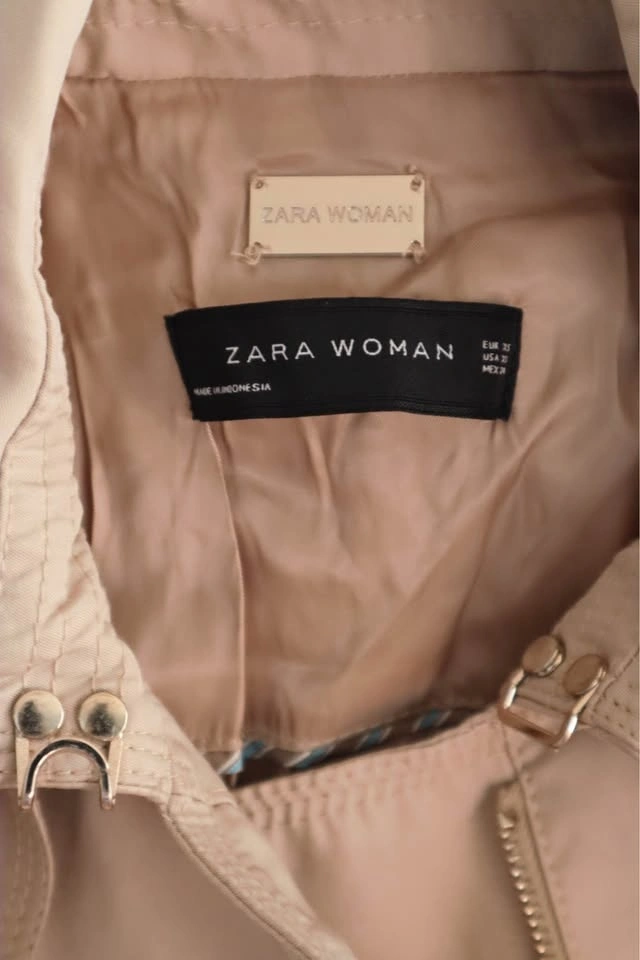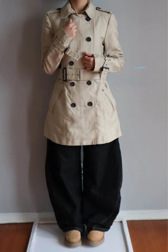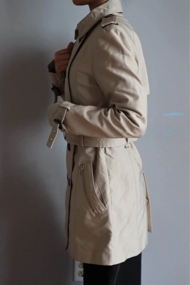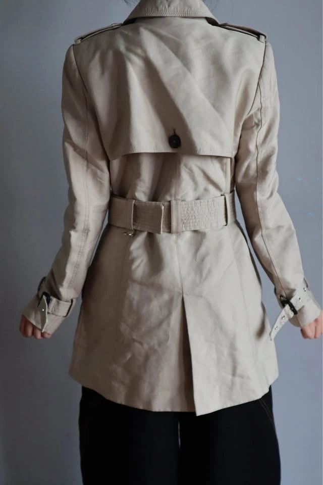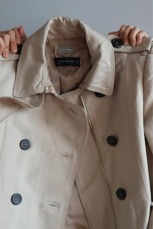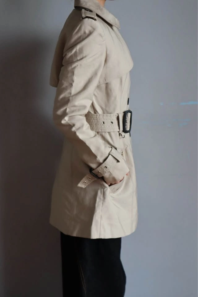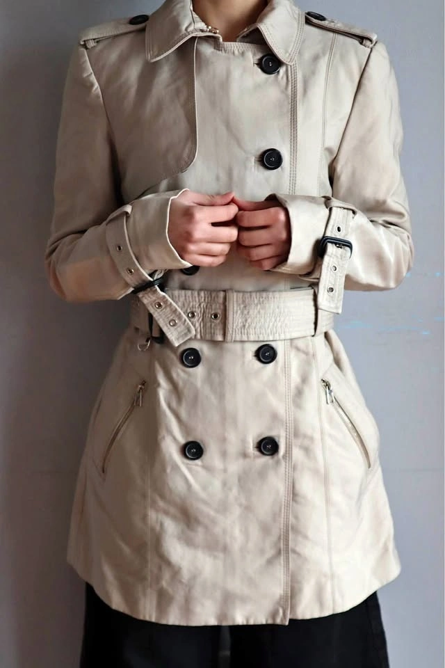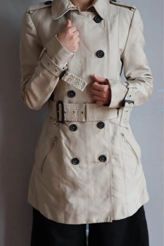 Classic trench coat. Double-breasted design with black buttons. Has a matching belt. Adjustable cuff straps and shoulder details. Zippered pockets on front. Super versatile, great for layering.