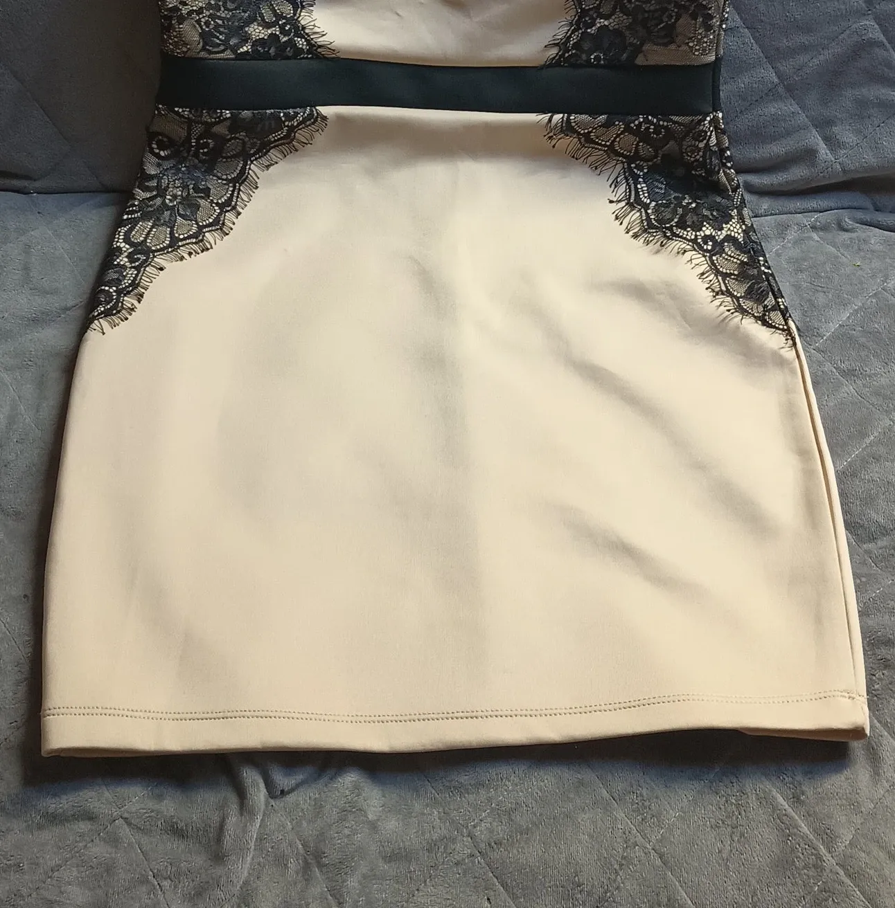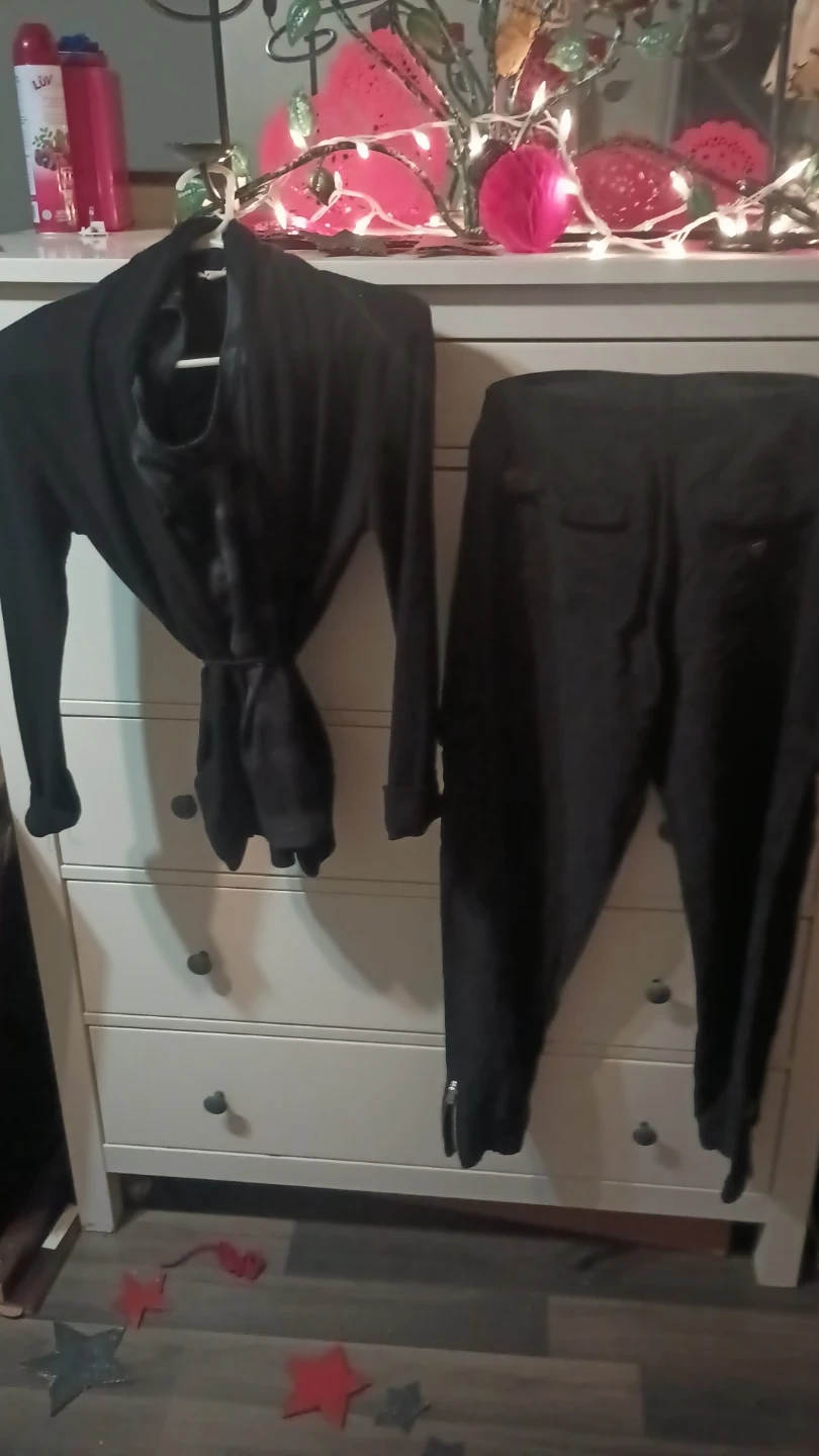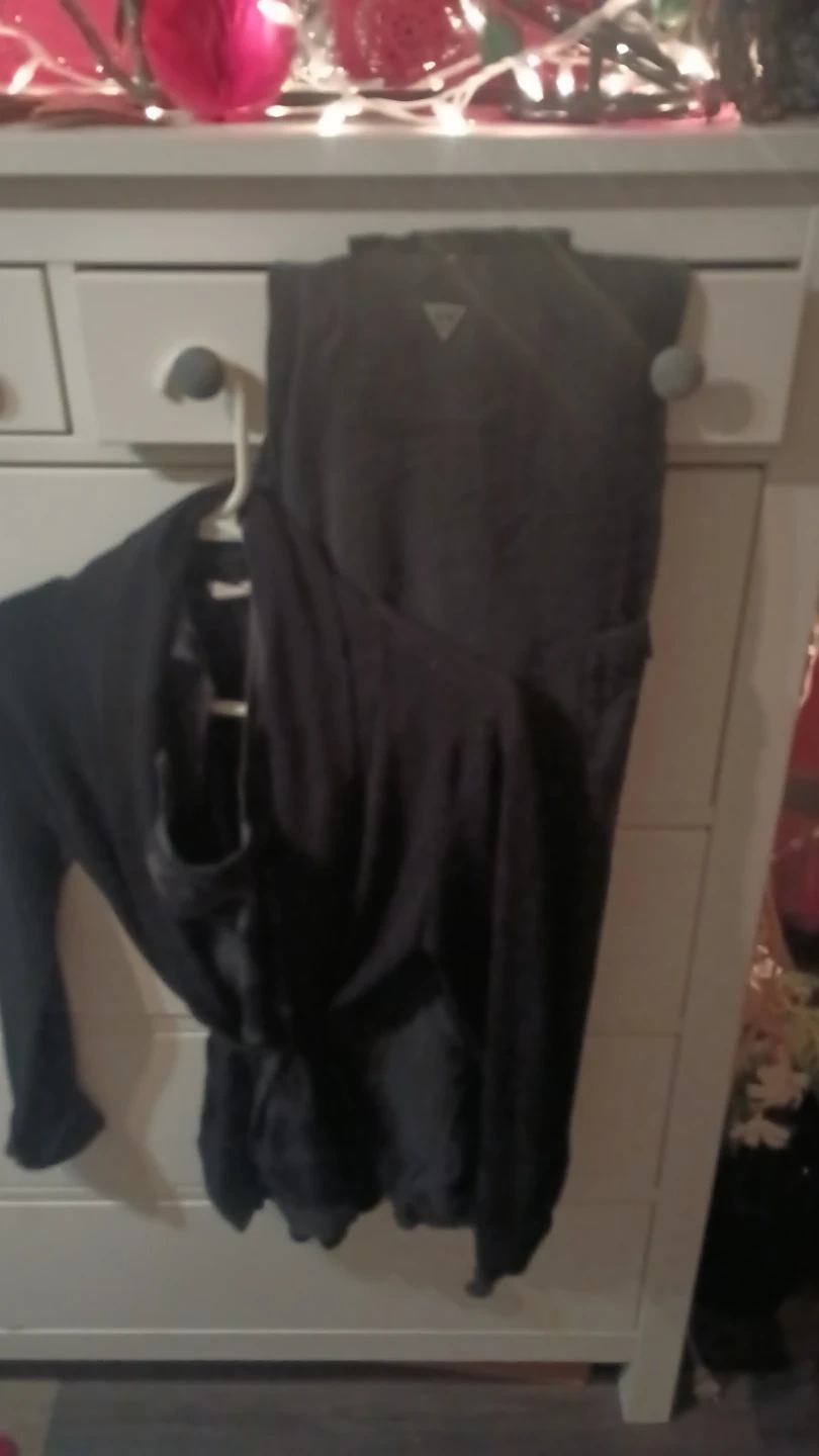 A sophisticated dress featuring a sheer black lace overlay and a matching black cardigan. This elegant set is perfect for evenings out or special occasions. The dress has a fitted silhouette with lace detailing on the sleeves and neckline.