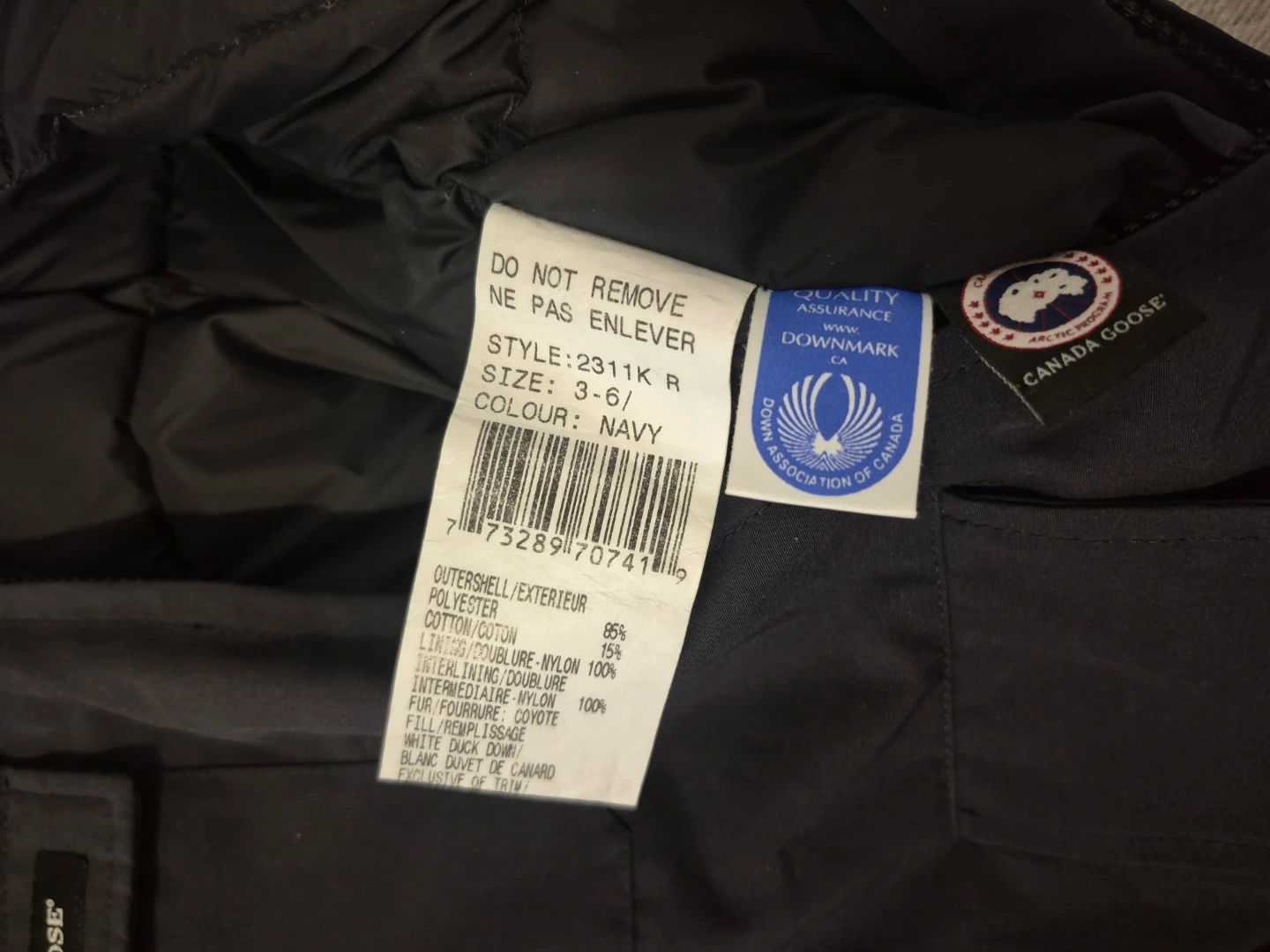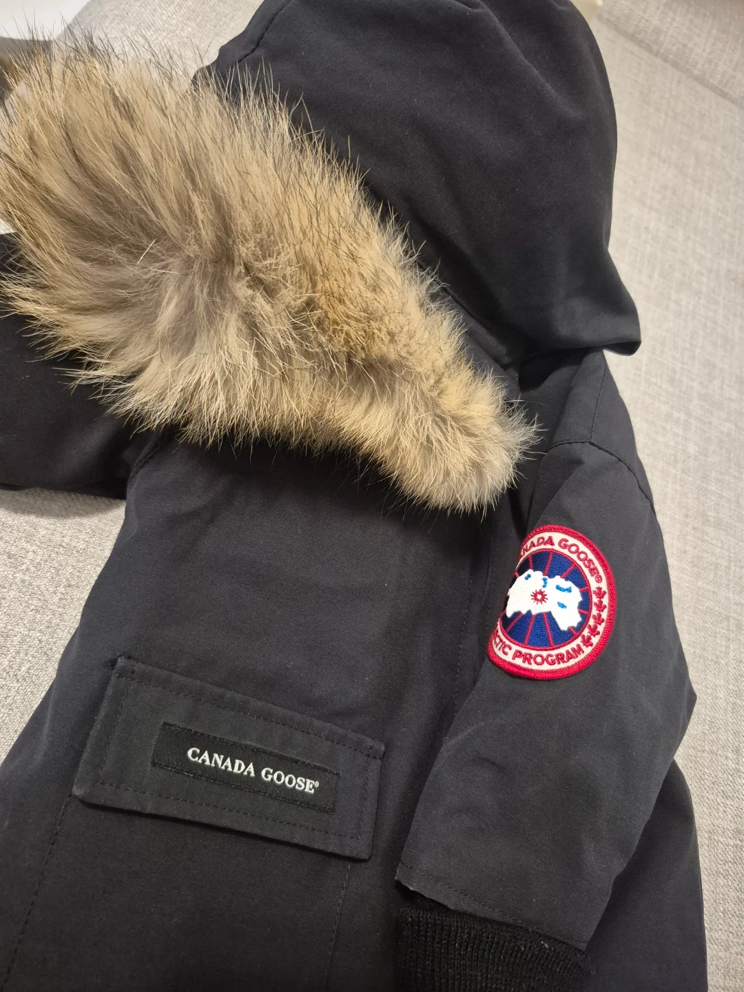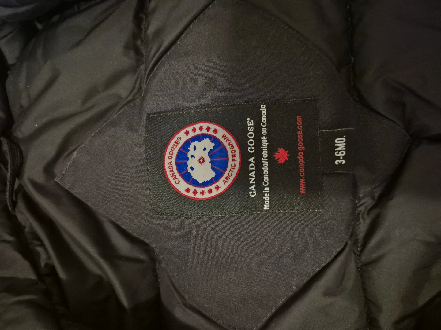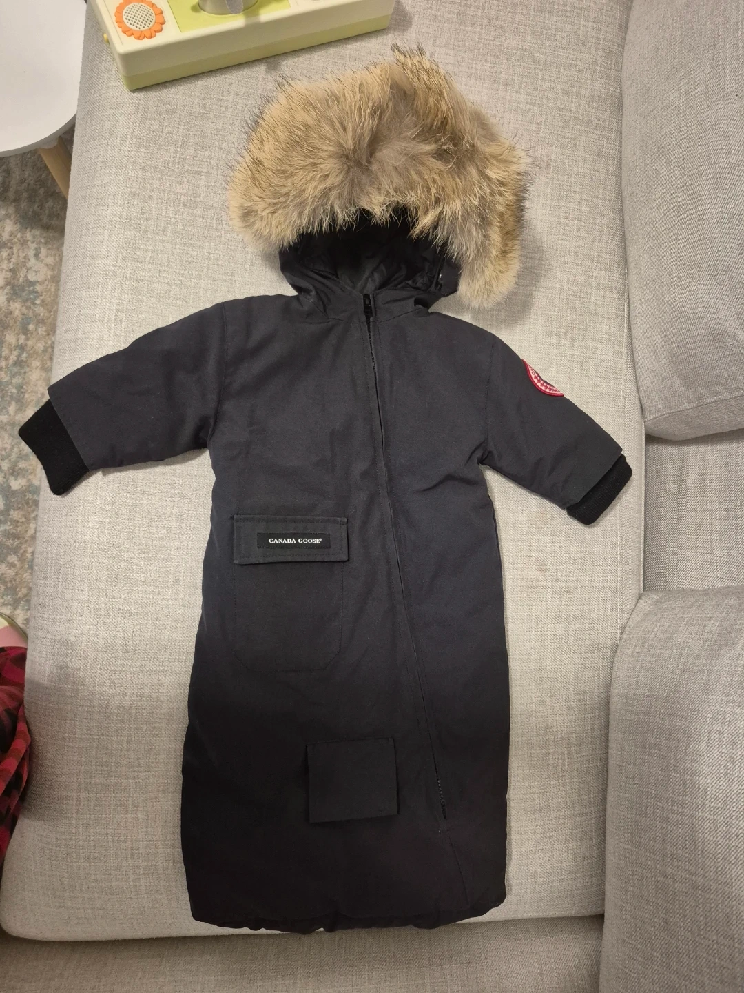 Canada Goose bunting suit in size 3-6 months. Made with polyester and cotton/nylon blend outershell linen. Features white duck down fill and coyote fur trim. Lightly used