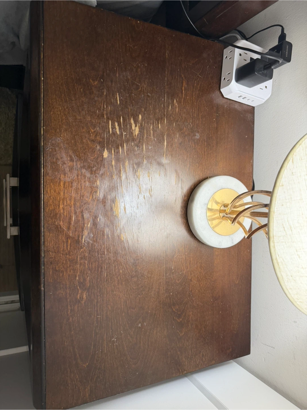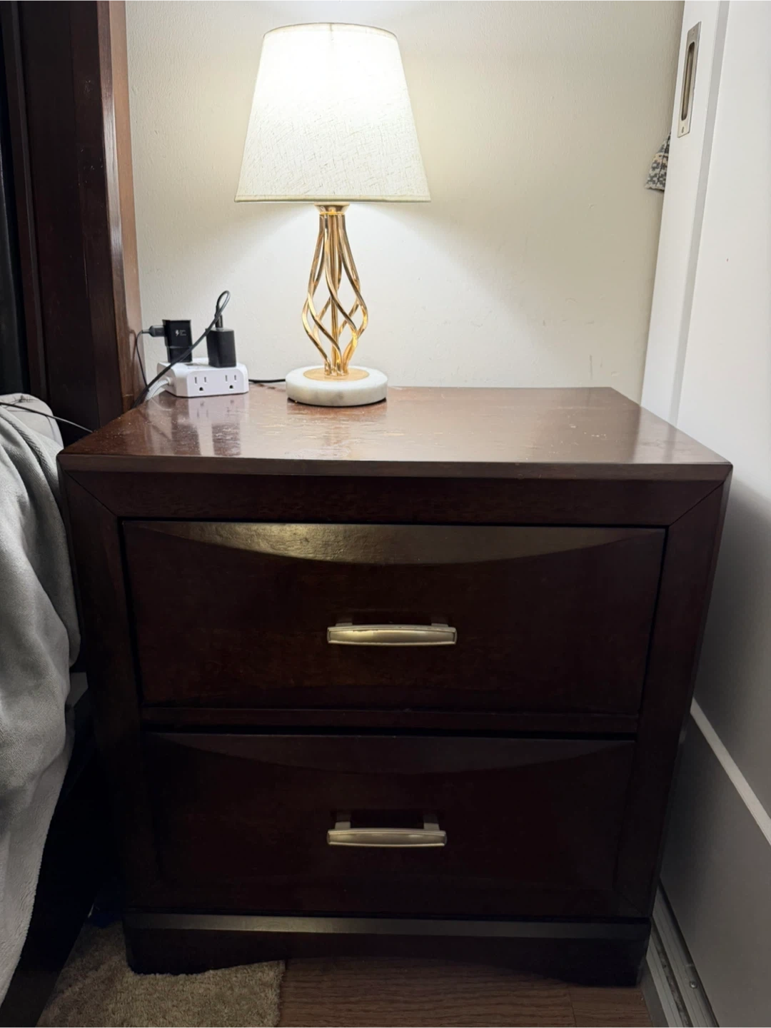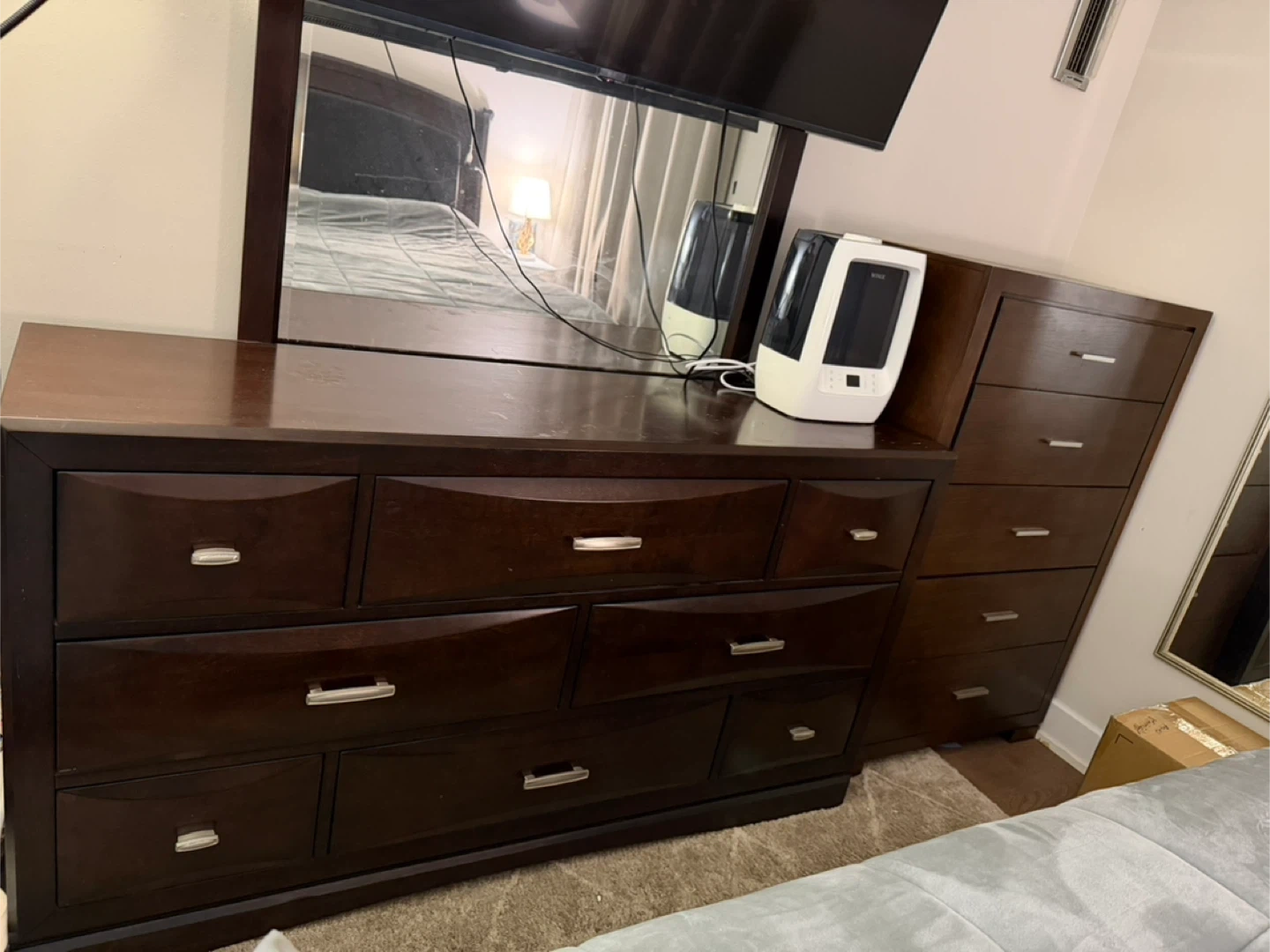Dark brown wooden dresser with a large mirror attached. Includes a smaller matching nightstand with two drawers. Some wear and tear visible on the dresser top.