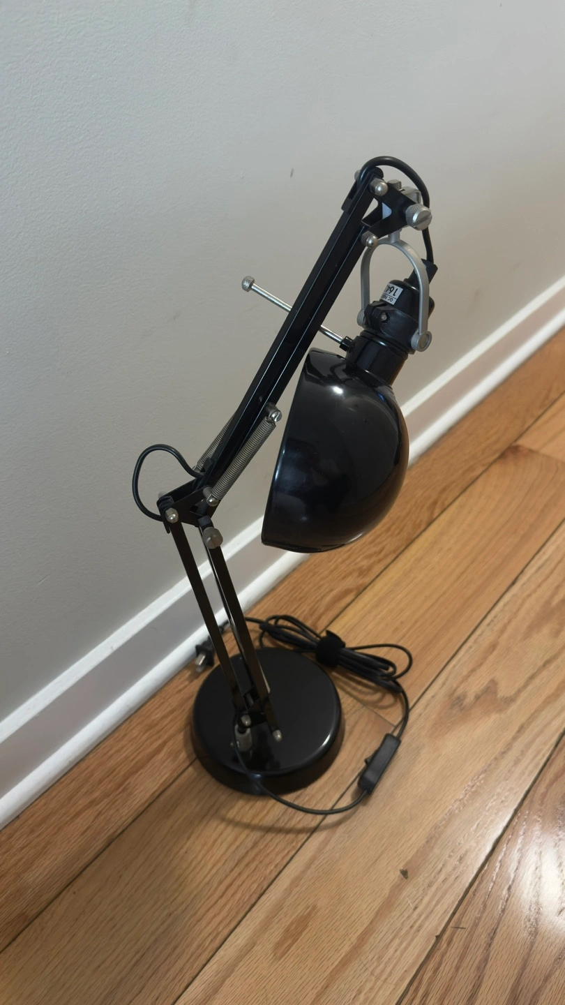 This is a classic black adjustable desk lamp. It has a flexible arm and head for directing light where you need it. It's great for a desk or workspace!