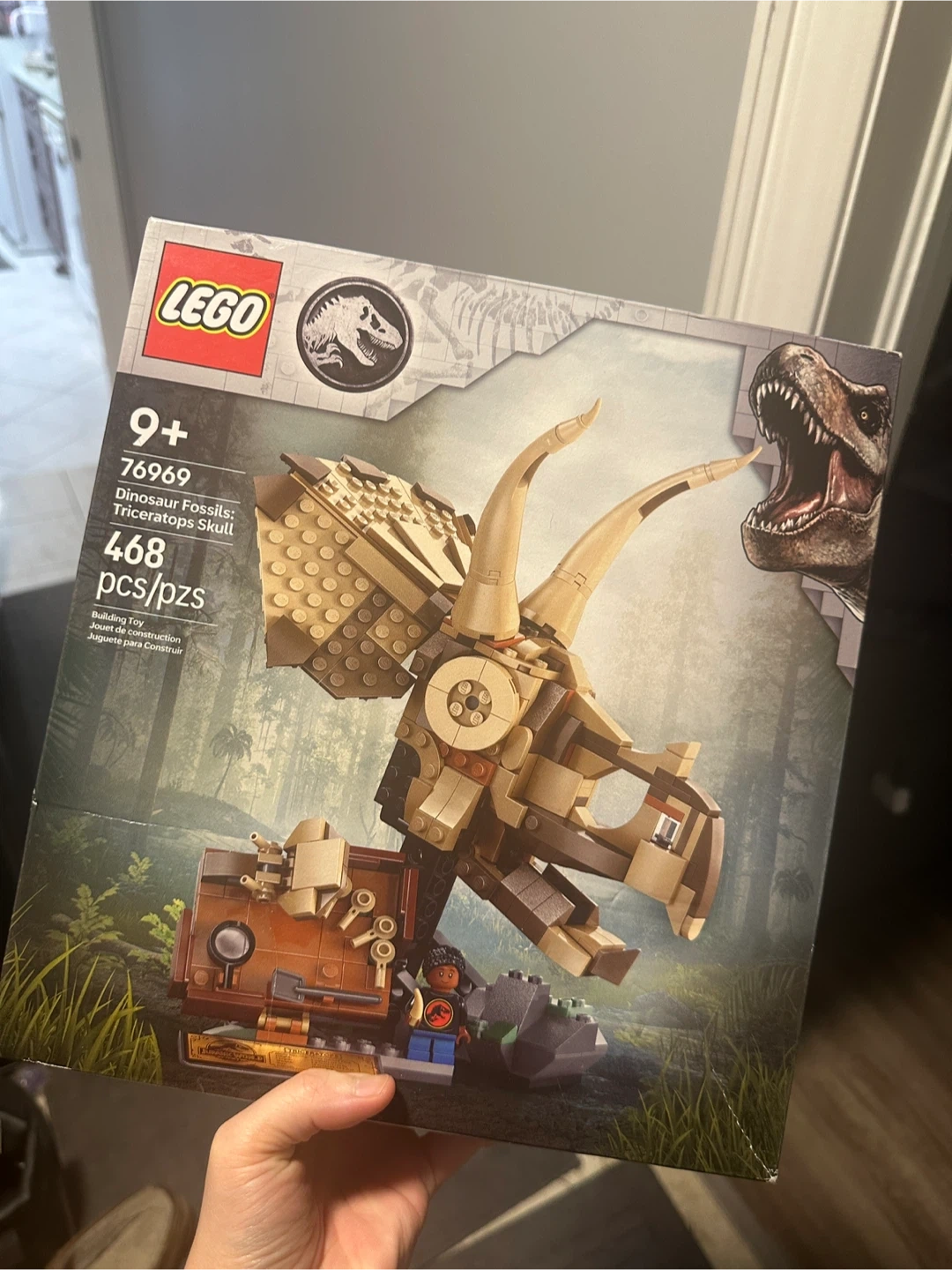 Build the LEGO Jurassic World Dinosaur Fossils: Triceratops Skull set. It's a building toy with 468 pieces. This set is suitable for ages 9 and up. It's great for dinosaur and LEGO enthusiasts!