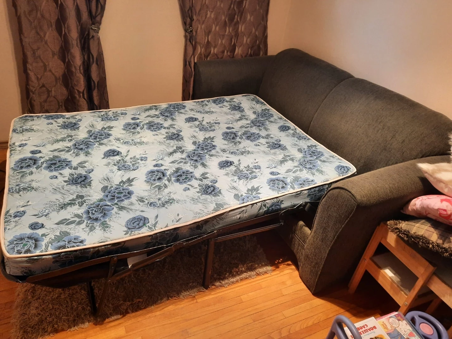 This sectional sofa easily converts into a bed! It's upholstered in a durable dark green fabric and includes a floral-patterned mattress. Comes with a metal frame for bed functionality.