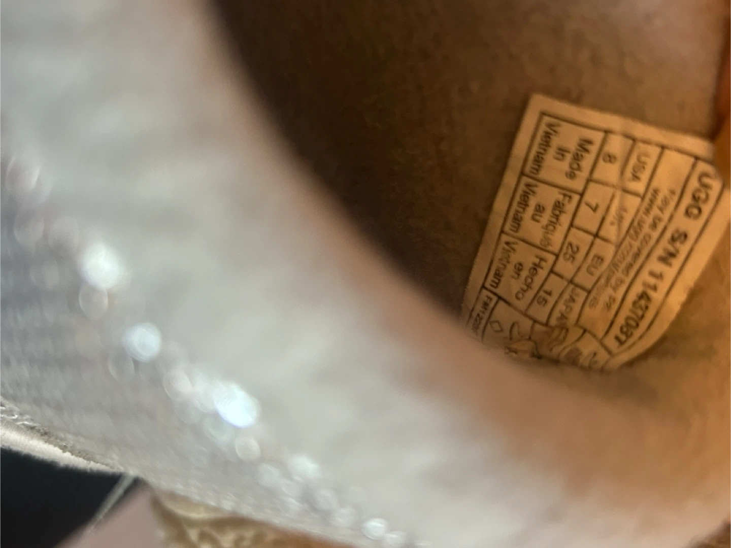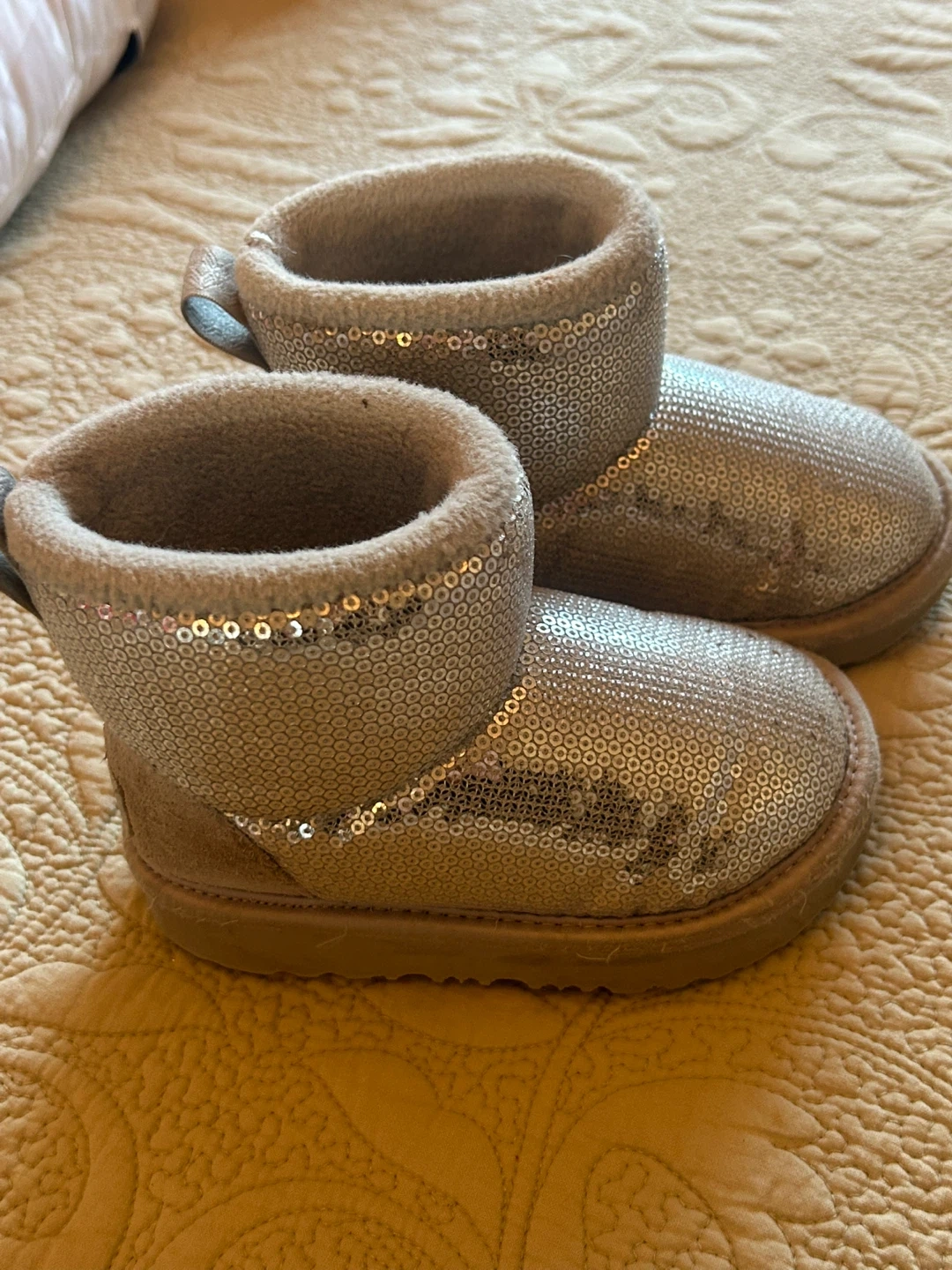 Sparkly UGG sequined mini boots for kids. These cozy boots are a size 8. They feature a soft lining and sequined exterior.