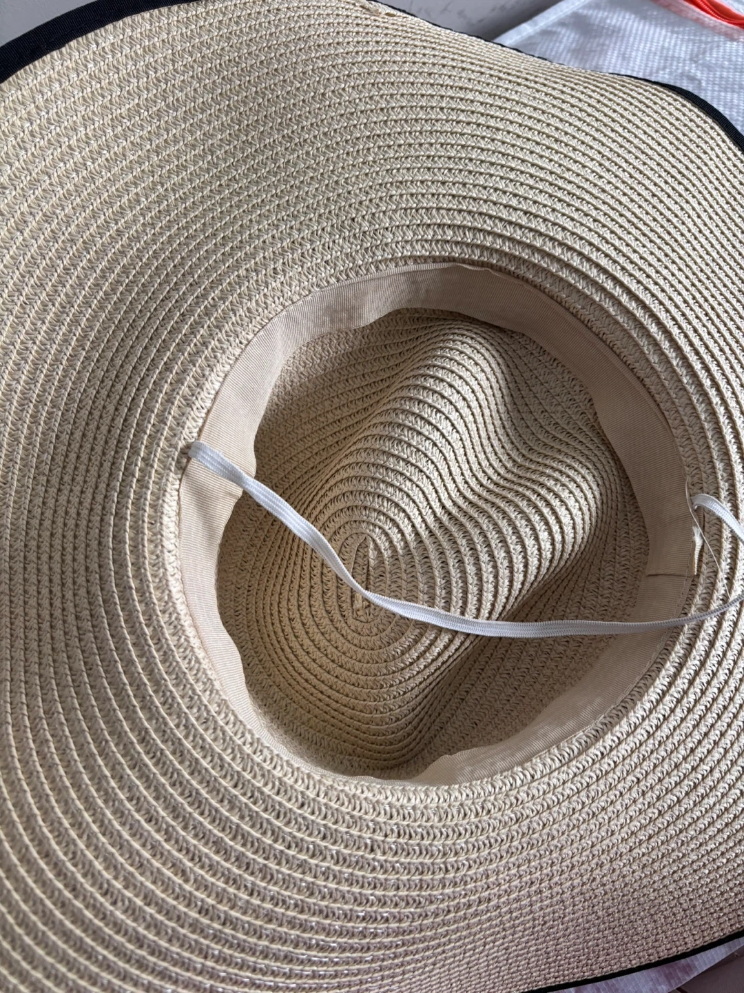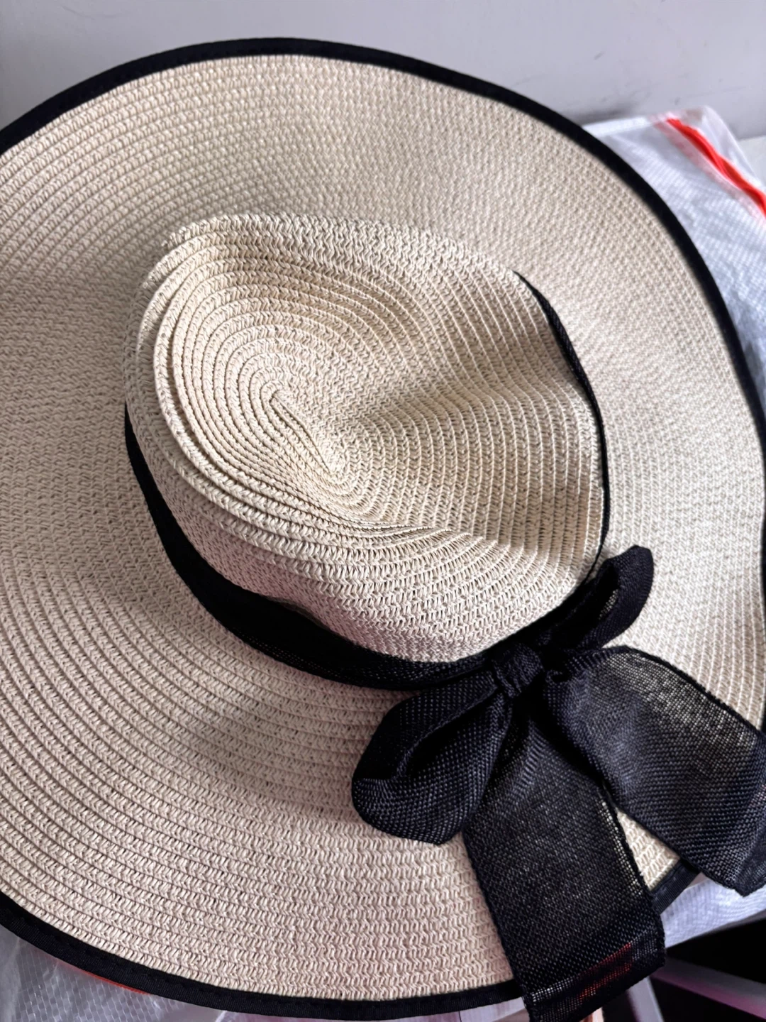 A stylish straw hat with a wide brim for sun protection. It features a black ribbon and bow accent. Made from woven straw material. Perfect for sunny days out!