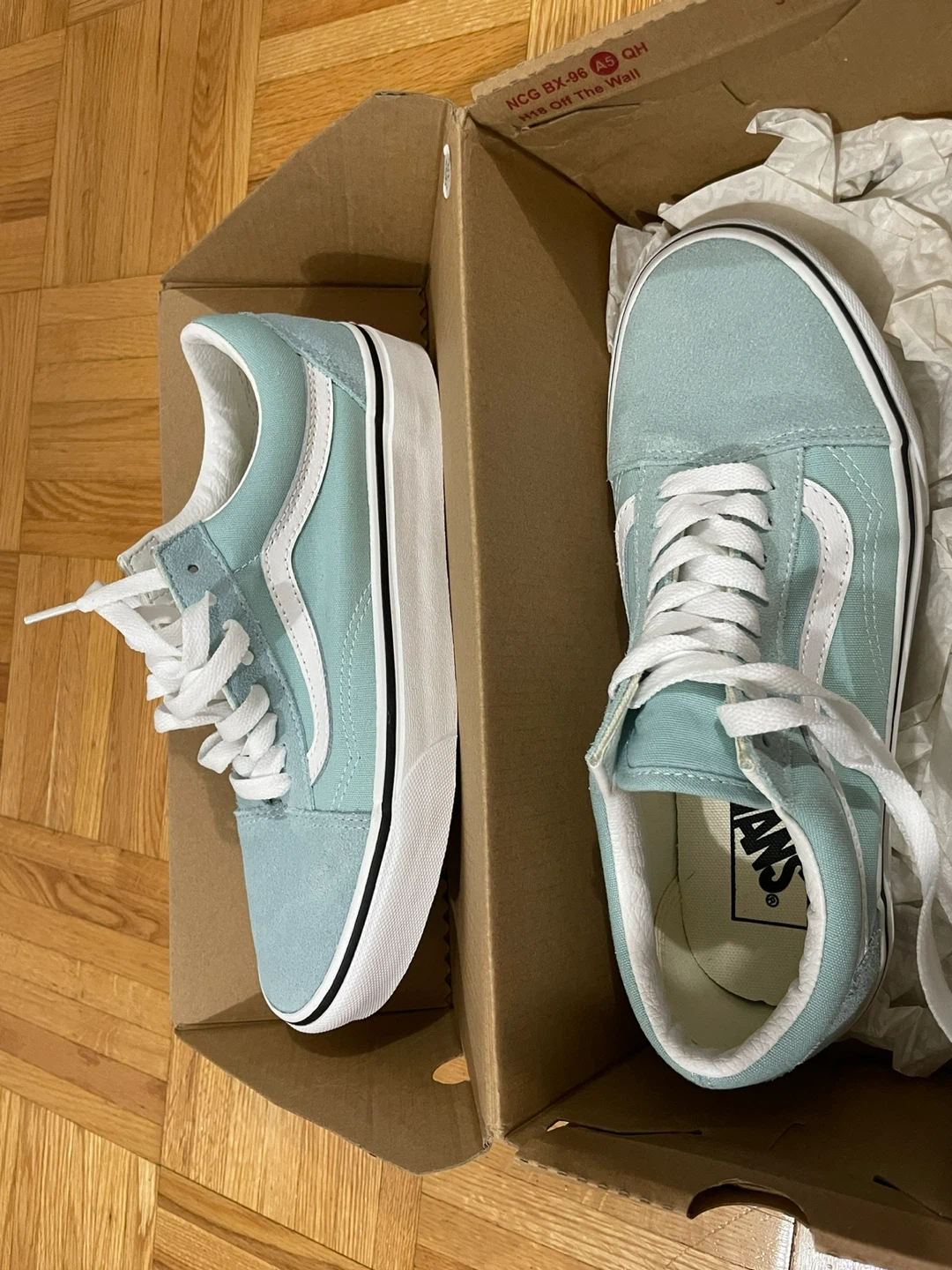 Selling a pair of light blue Vans Old Skool shoes.