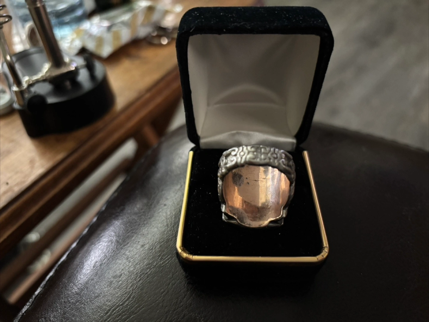 Heavy, ornate signet ring. Features a detailed crest. Purchased in Costarican antique shop many years ago. Gold and silver plated.