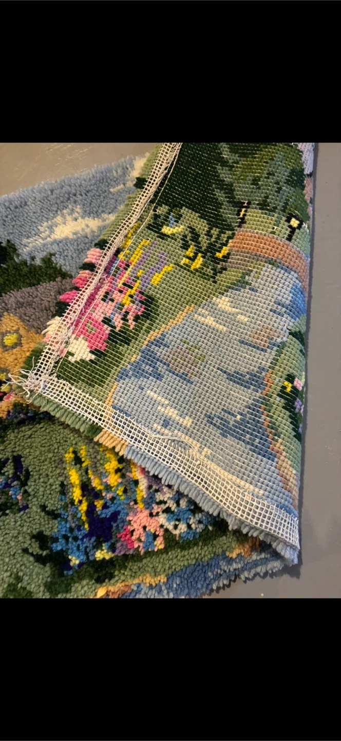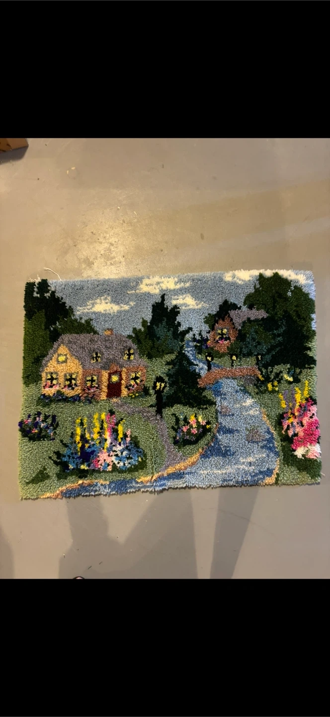 This is a vintage rug hooking kit featuring a charming countryside scene. It depicts a yellow house with a red door, a winding blue stream, and colourful flowers. The backing appears to be a white mesh material, ready for completion. It's a lovely piece for home decor to use as a rug or tapestry.