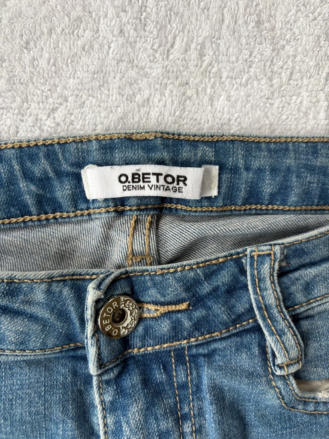 O.BETOR Denim Vintage jeans in a light wash with distressing and a raw hem. Mid-rise fit with button and zipper closure. Cotton blend material.