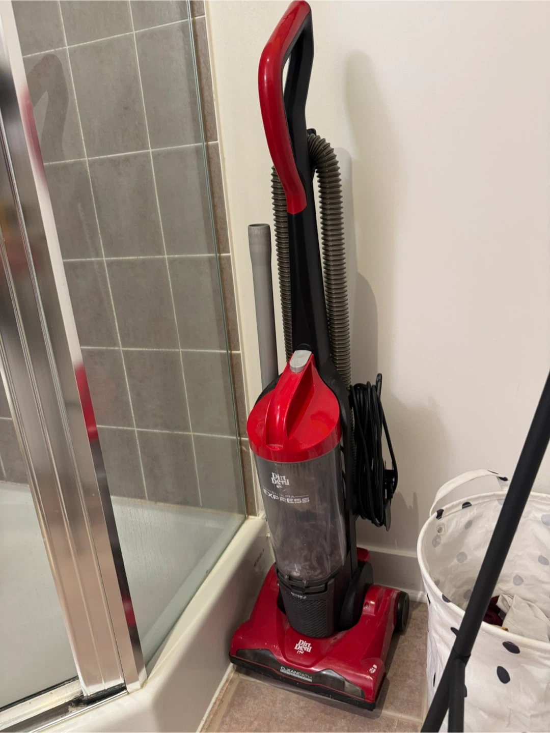 This is a red Dirt Devil Express upright vacuum. This vacuum is lightweight and easy to manoeuvre.
