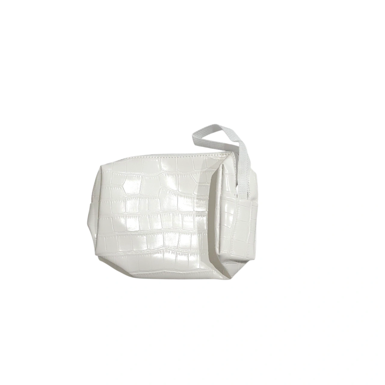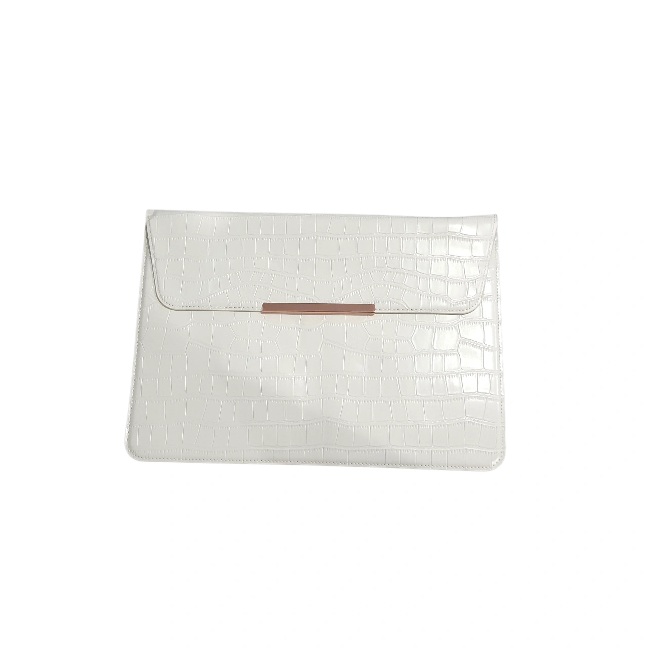 A white faux crocodile laptop bag set. It includes a larger envelope-style clutch sleeve with magnetic snap closure, and a smaller accessories pouch. Shiny, structured material.