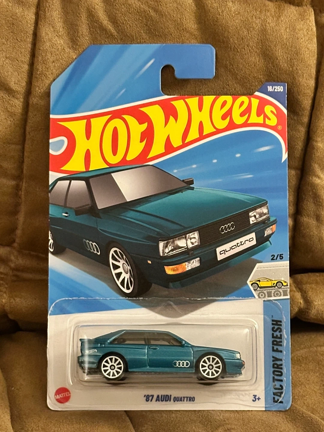 Two Hot Wheels '87 Audi Quattro diecast cars. One teal and one black. Part of the Factory Fresh series.