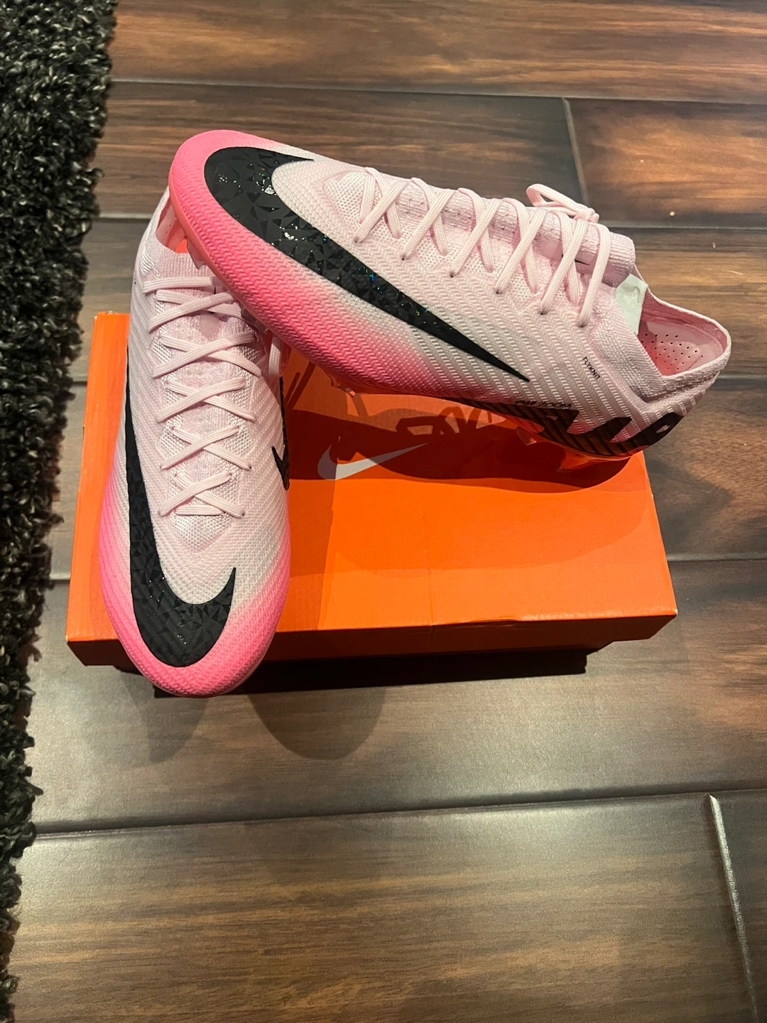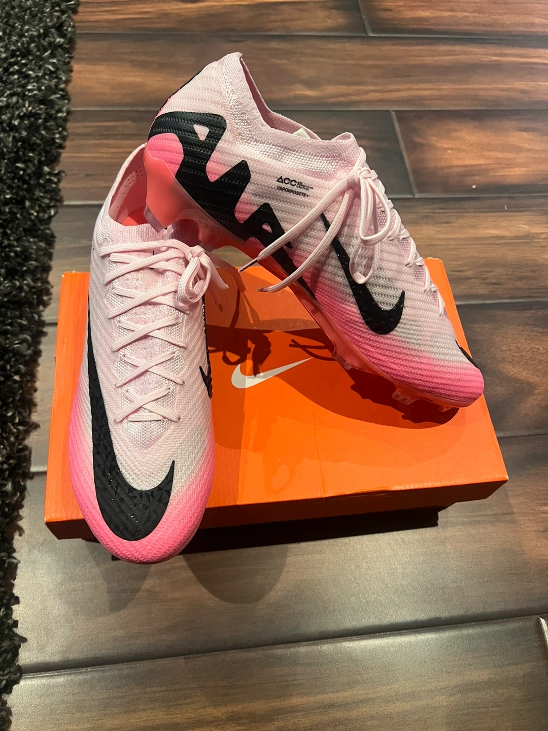 Nike Mercurial Vapor 14 Elite soccer cleats in pink. These cleats feature Flyknit construction and ACC technology for enhanced ball control. FG soleplate designed for firm ground use. Includes original box.