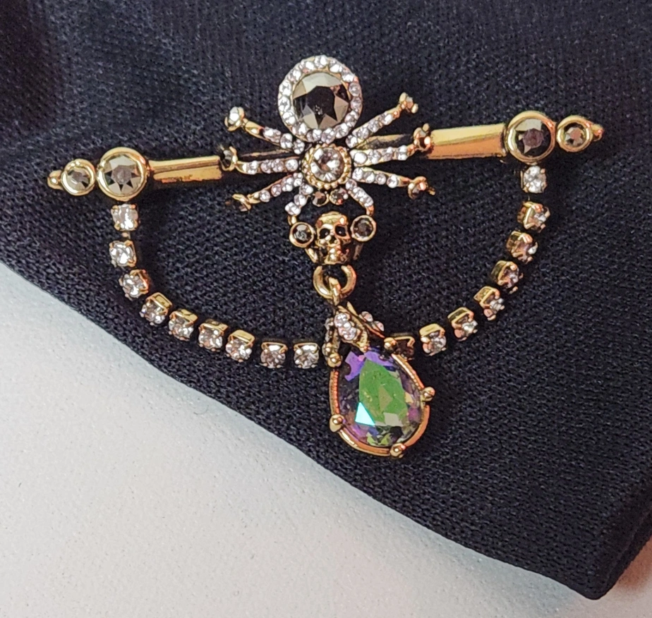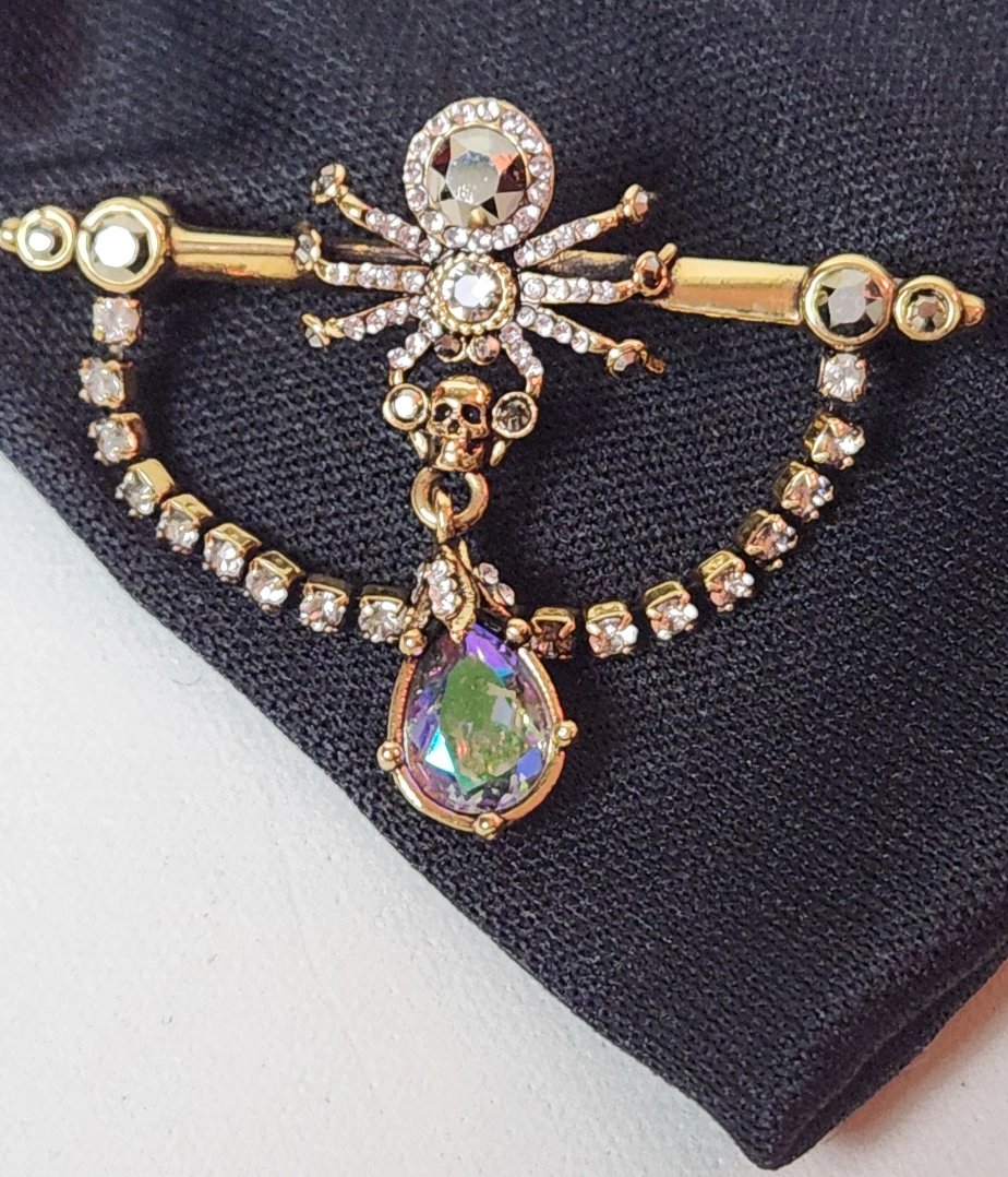 Antique gold-finished spider brooch, adorned with Swarovski crystals and signature skull.