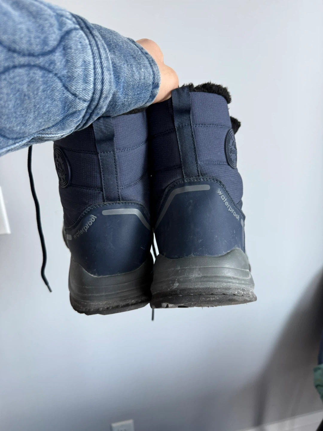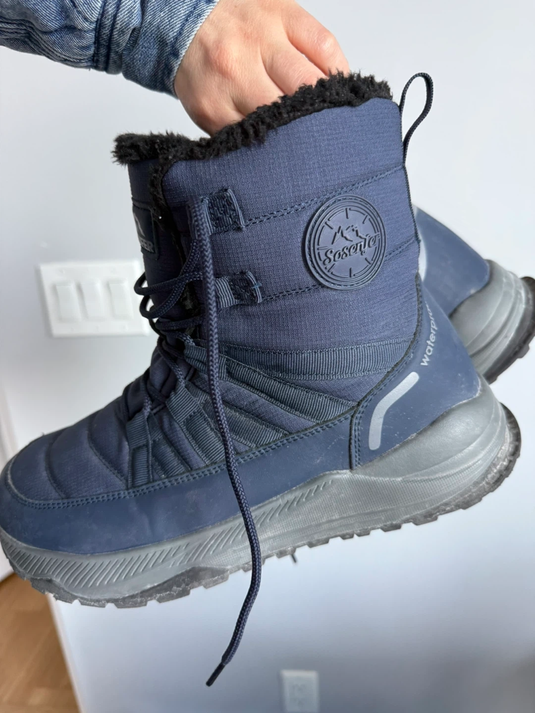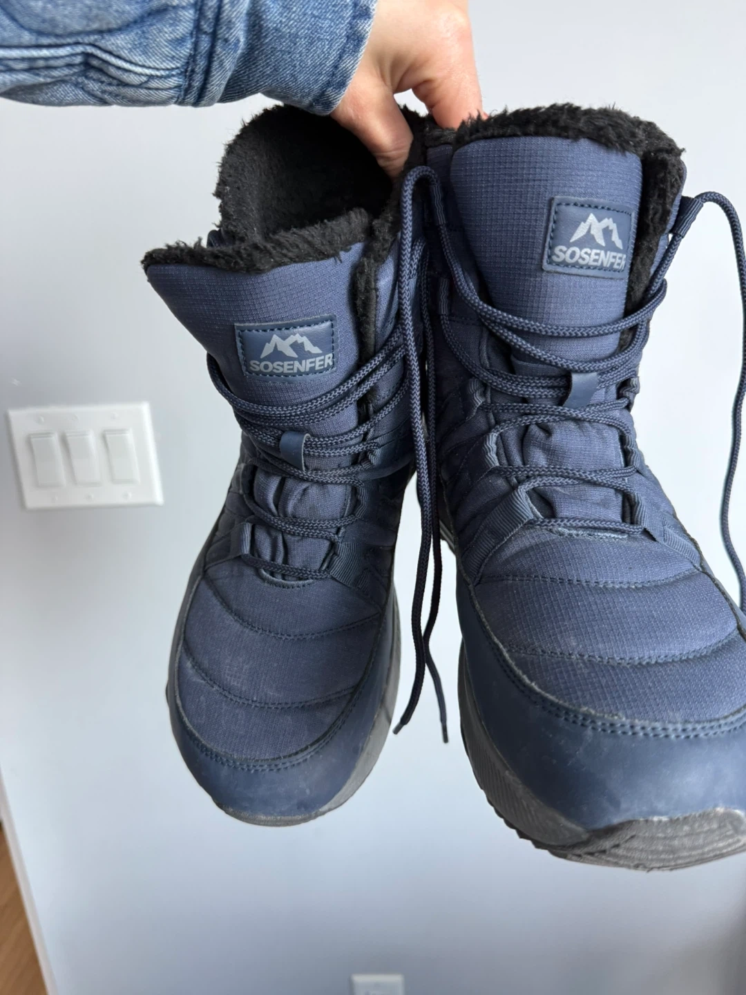 These SOSENFER boots are navy blue and waterproof, perfect for winter weather. They feature a warm, furry lining for extra comfort. Ideal for staying cozy and dry during snow or rain!