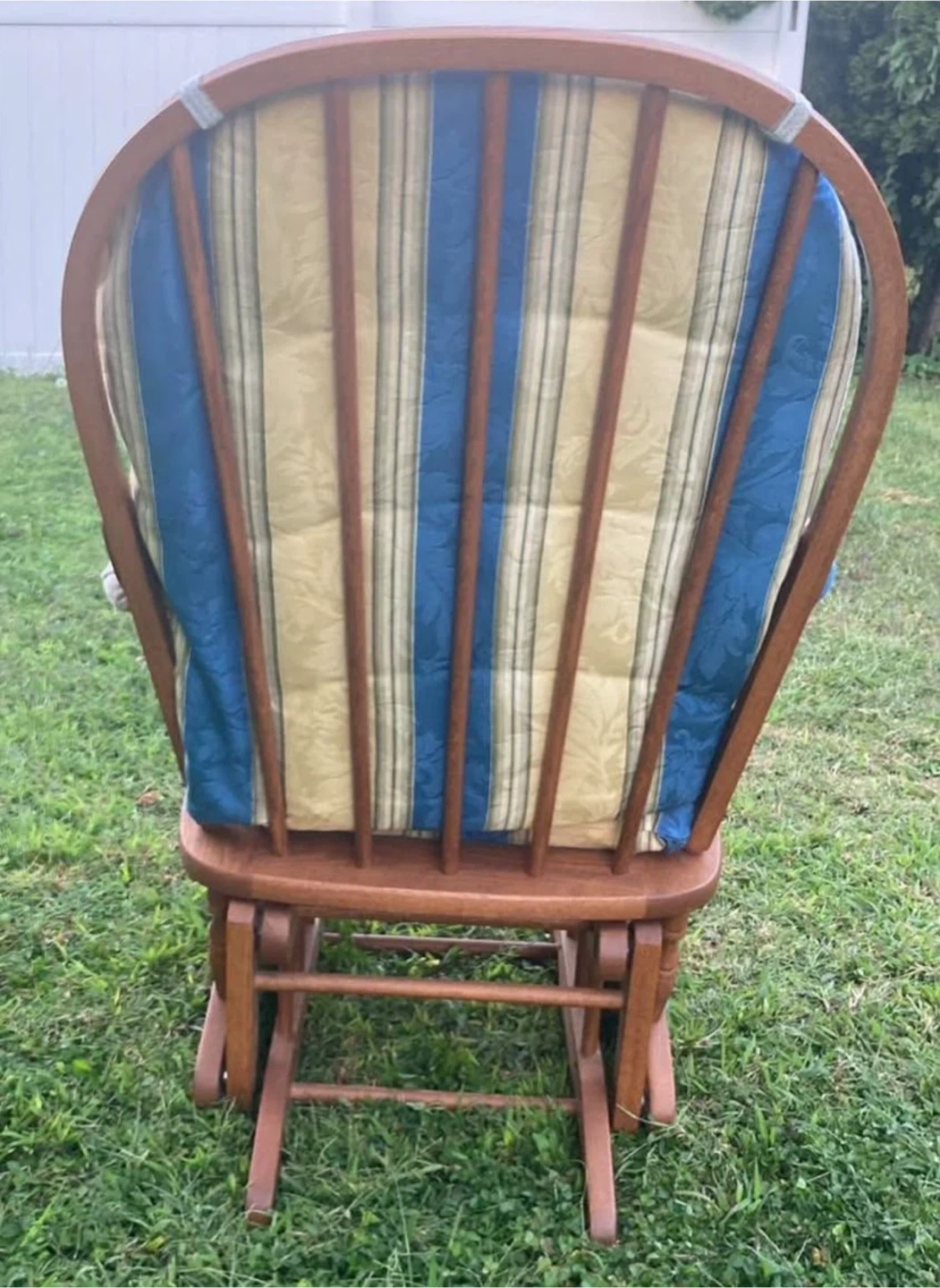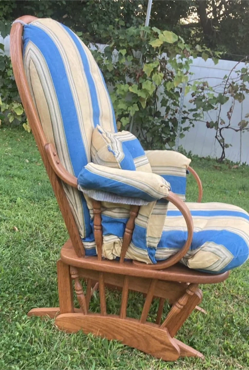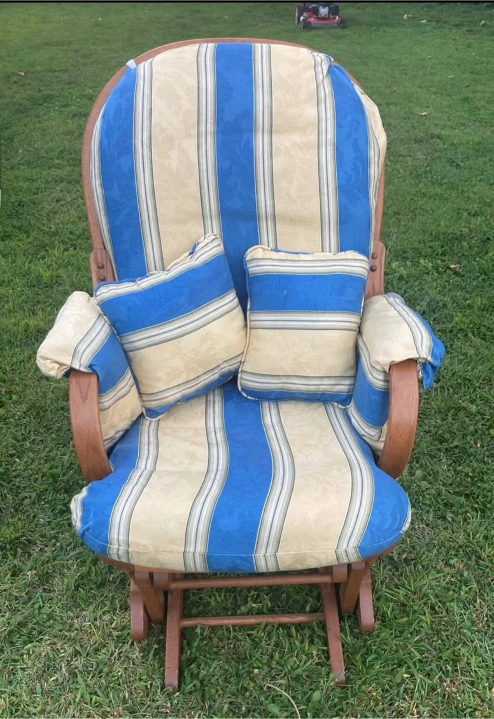 Wooden glider rocker chair featuring comfortable, upholstered cushions. The cushions have a blue and beige striped pattern with accent pillows. It's made of wood with a natural finish. Offers a gentle rocking motion. Price is negotiable.Cash only .
