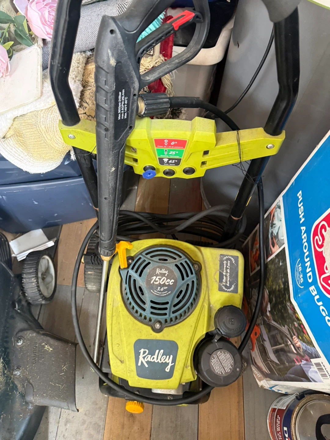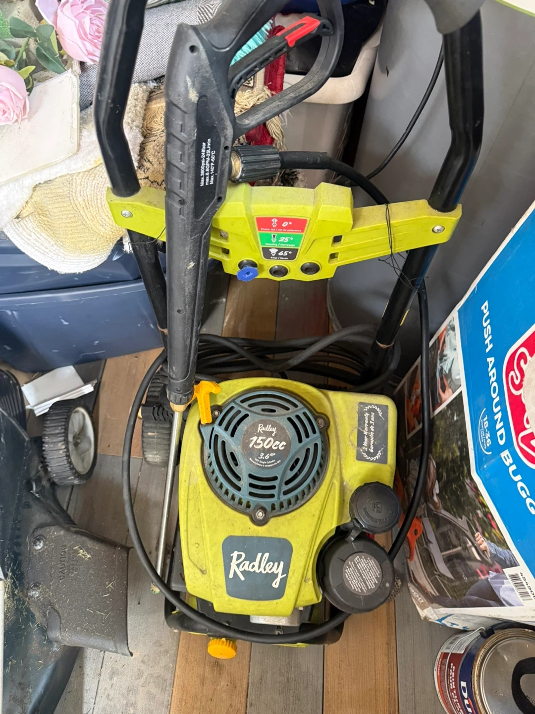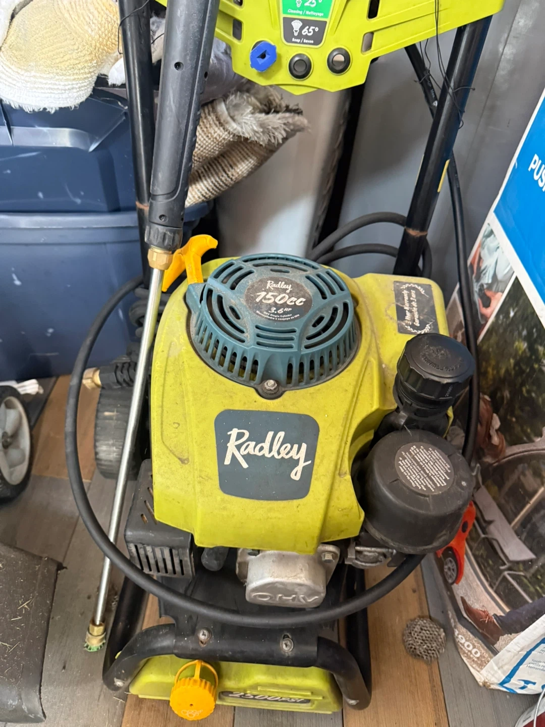This is a Radley pressure washer with a 150cc engine and 3.6 GPM. It's great for cleaning driveways and siding. Includes original spray gun and hose.