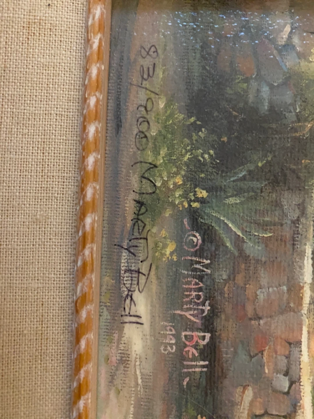 This is a limited edition fine art reproduction of "Umbrella Cottage" by Marty Bell. It's a 9"x12" print, part of a limited run of 900 pieces, numbered 83/900. The print is on coated stock, transferred onto canvas, and signed by the artist. A certificate of authenticity is included, confirming its original purchase in March 1993. This artwork would be a charming addition to any home decor.
