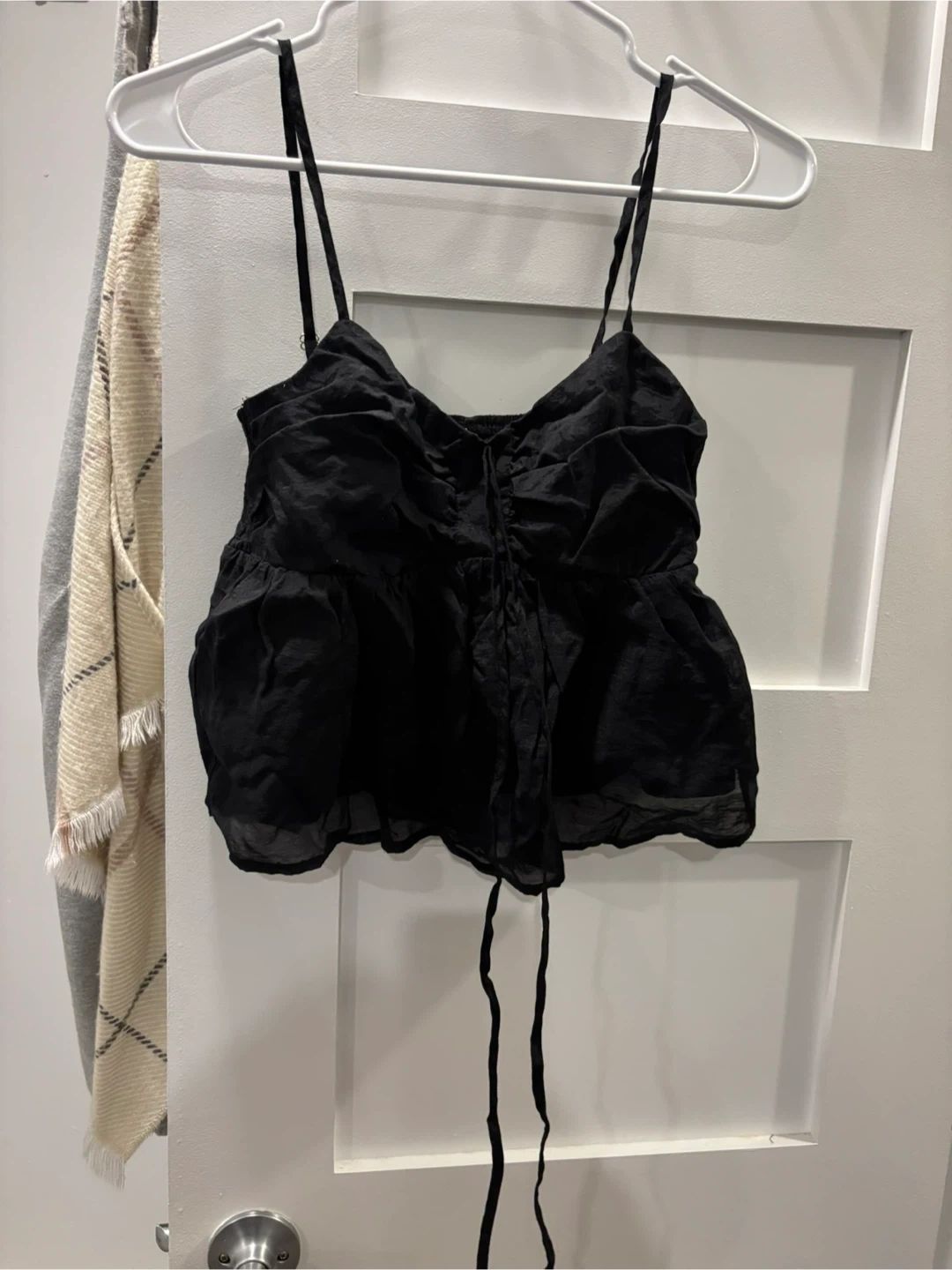 This is a black cami top. It features adjustable spaghetti straps and a tie front detail with a cinched waist. The material looks like a lightweight linen blend.