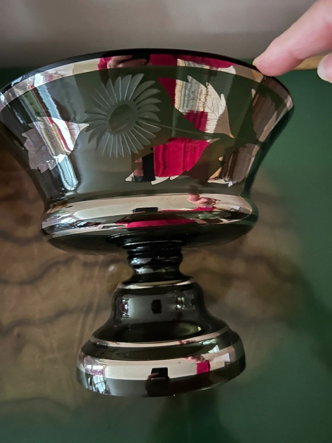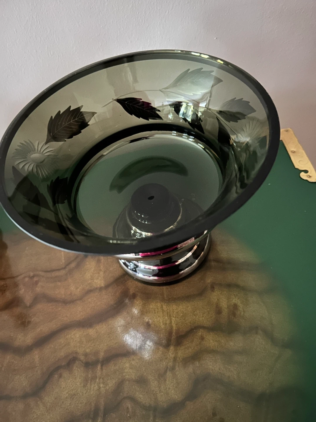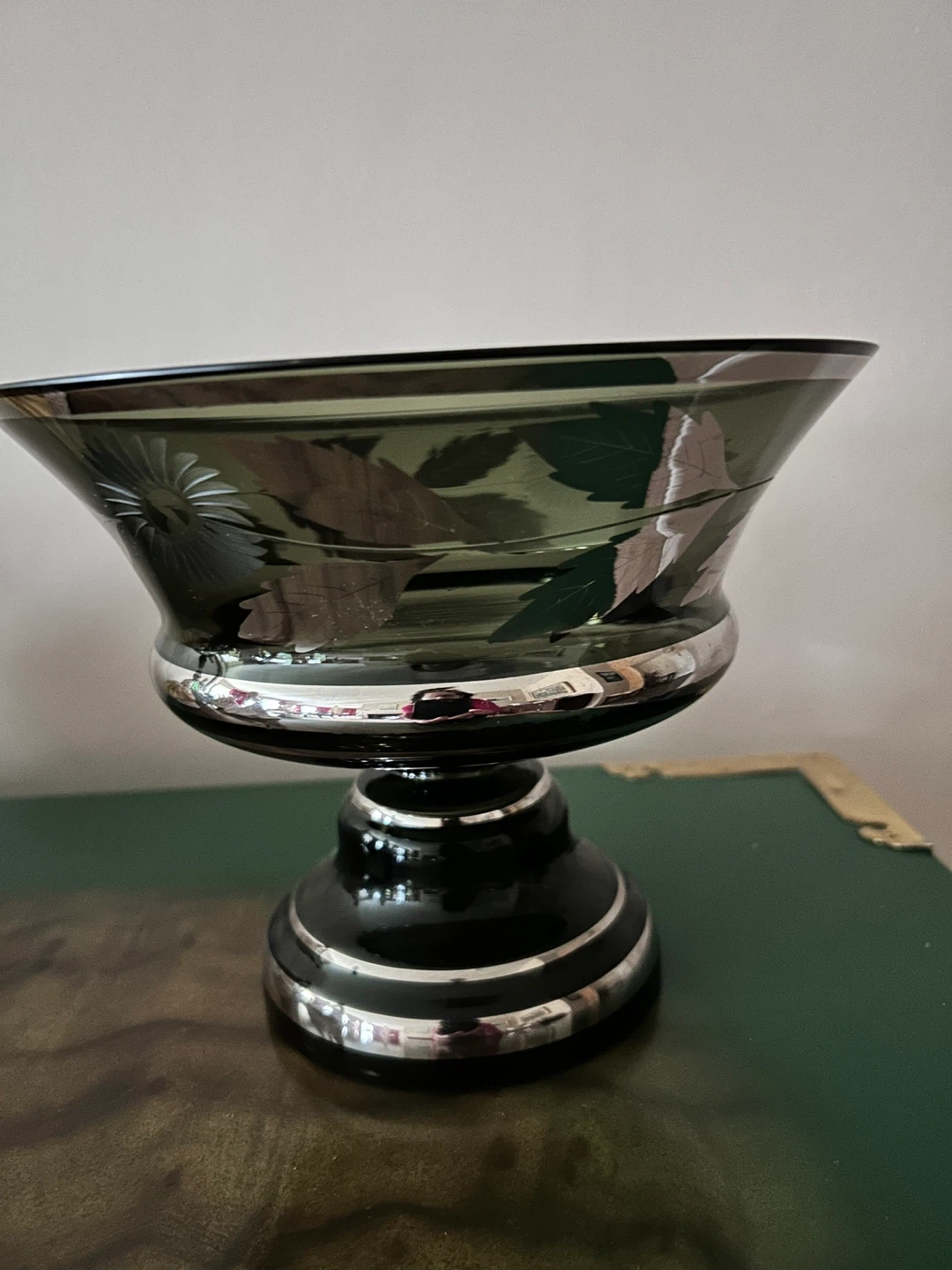 VINTAGE dark grey 8-inch glass bowl with etched floral and leaf designs, featuring silver-toned trim and a pedestal base. It's a lovely piece for serving or display. This would make a stylish addition to your tabletop decor!