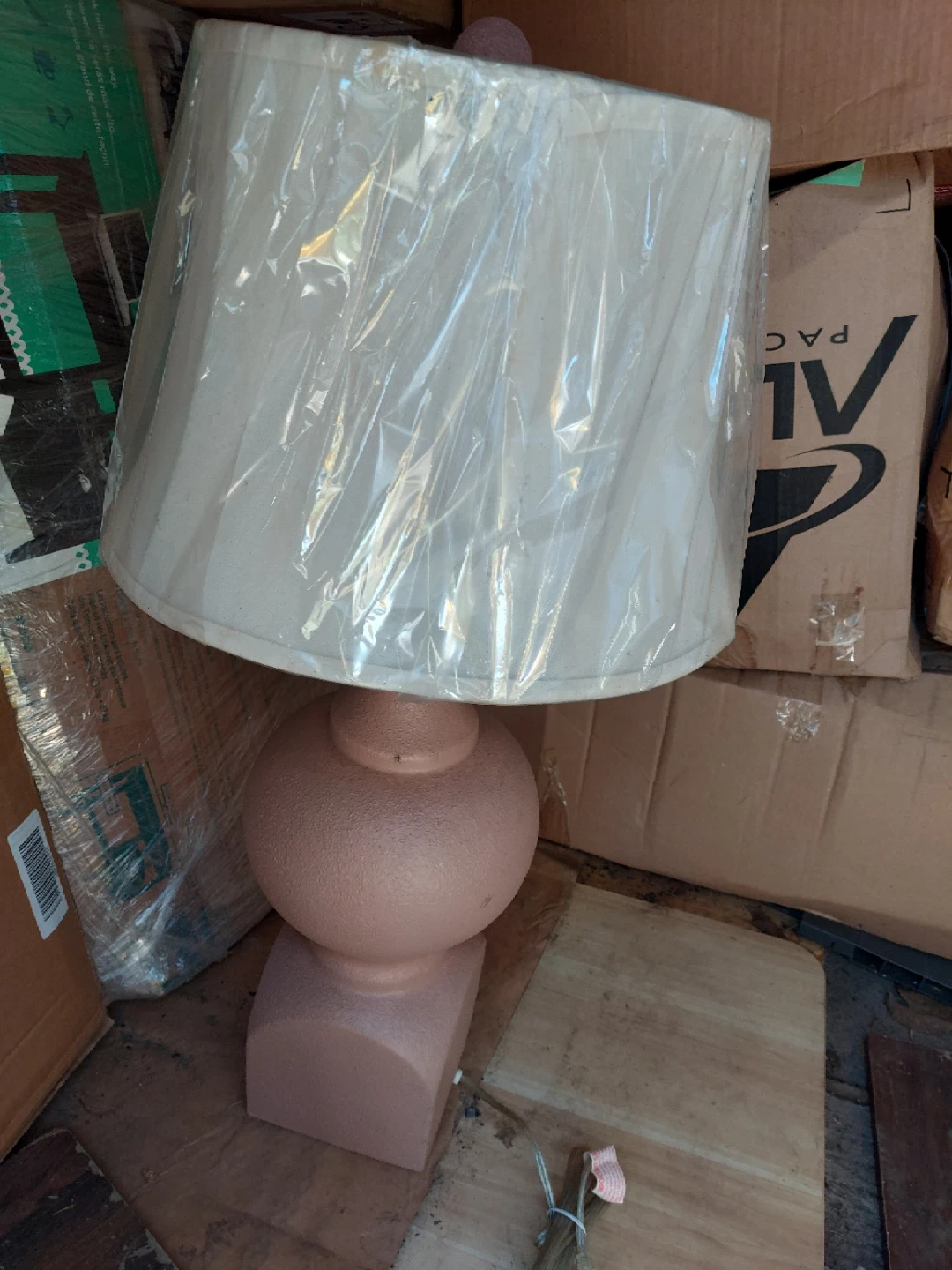 This is a table lamp. It has a round base and a white lampshade. The lamp's body is a textured pinkish-peach color.