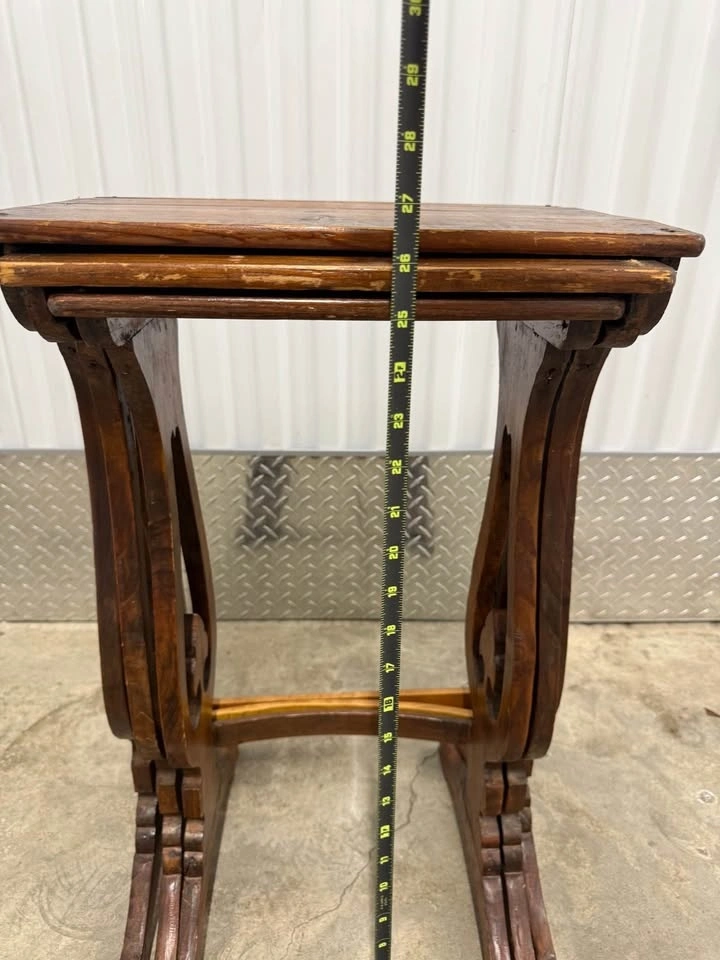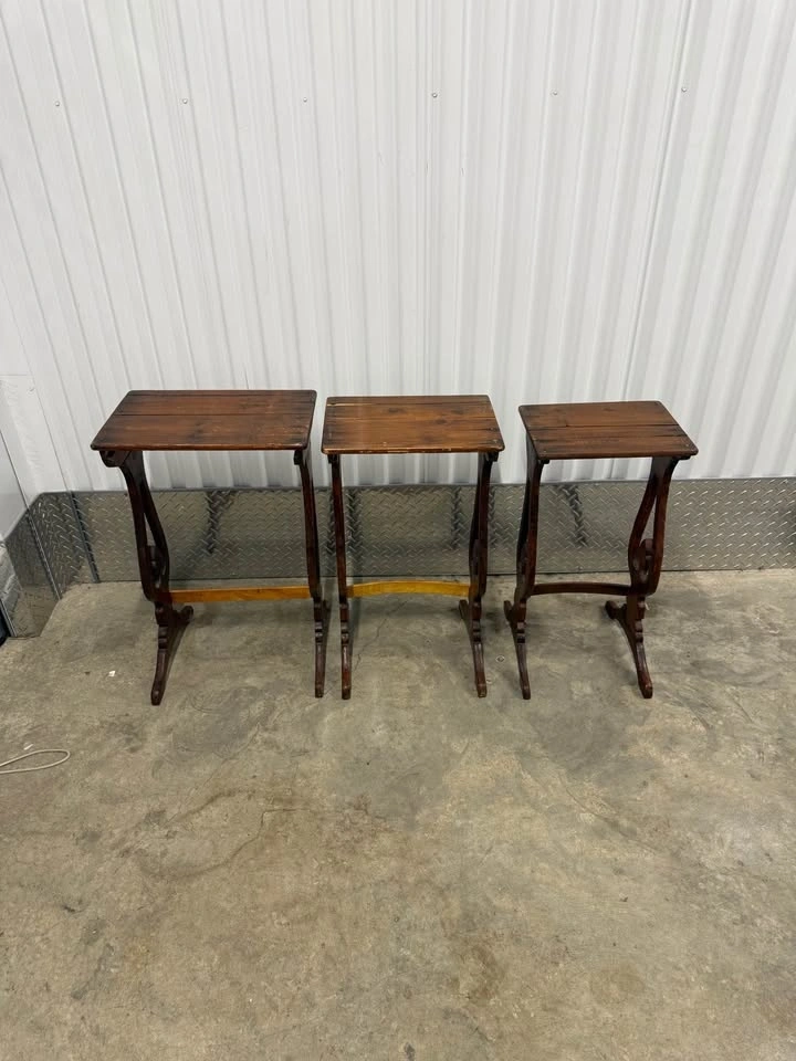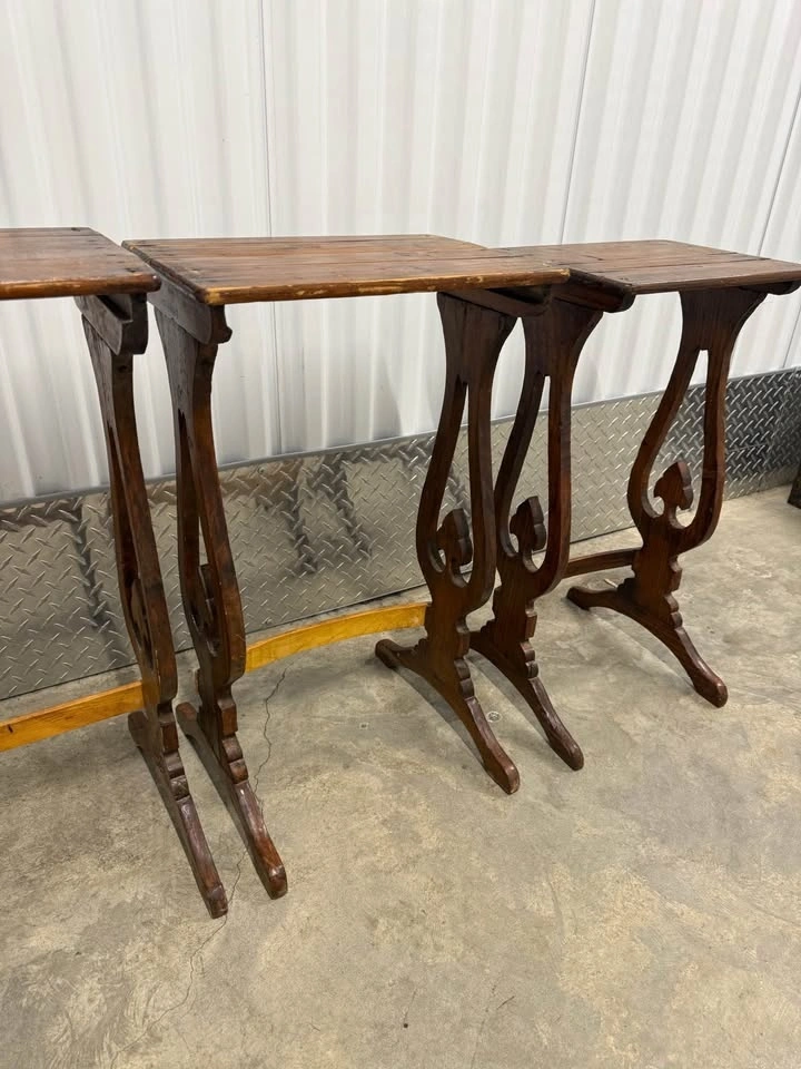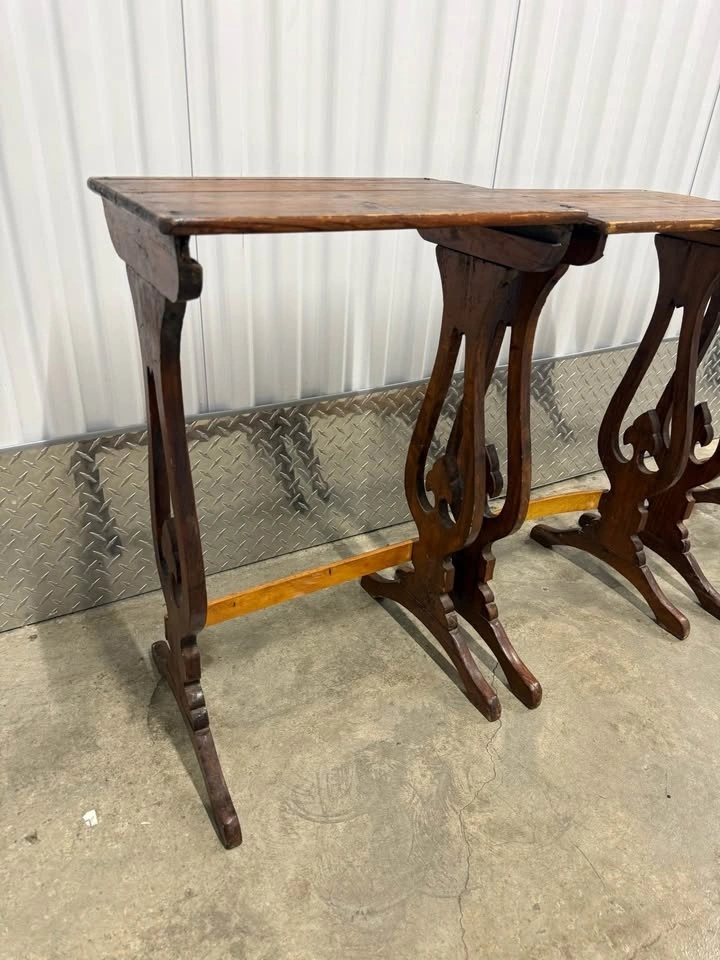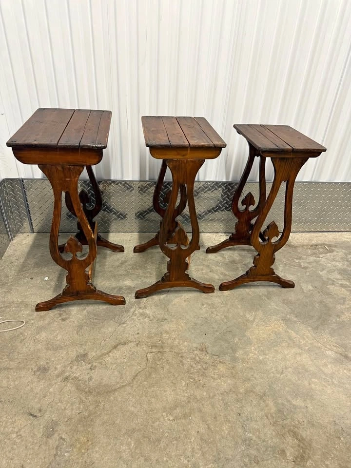 Stackable solid wood side tables featuring gothic-inspired cutout details. Great character and patina. Perfect as an accent table, plant stand, or statement piece. They definitely show use but the character is there. Height roughly 26”, tops are 16”x11”. Pickup in Prospect Park. Thanks for looking!